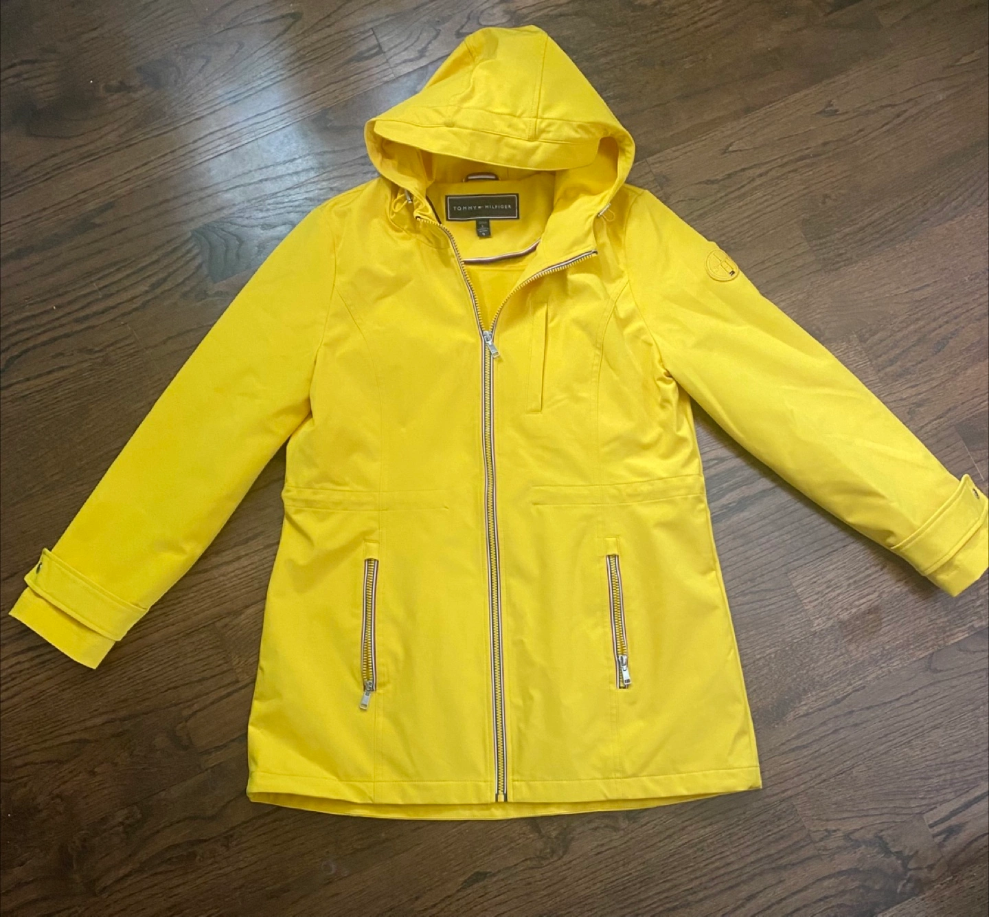 Selling a Tommy Hilfiger rain jacket in a bright yellow colour! It's a size large and has a hood.