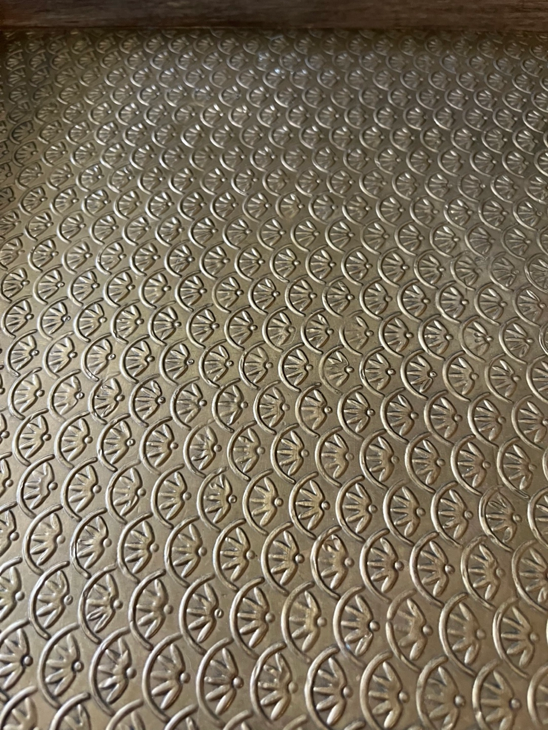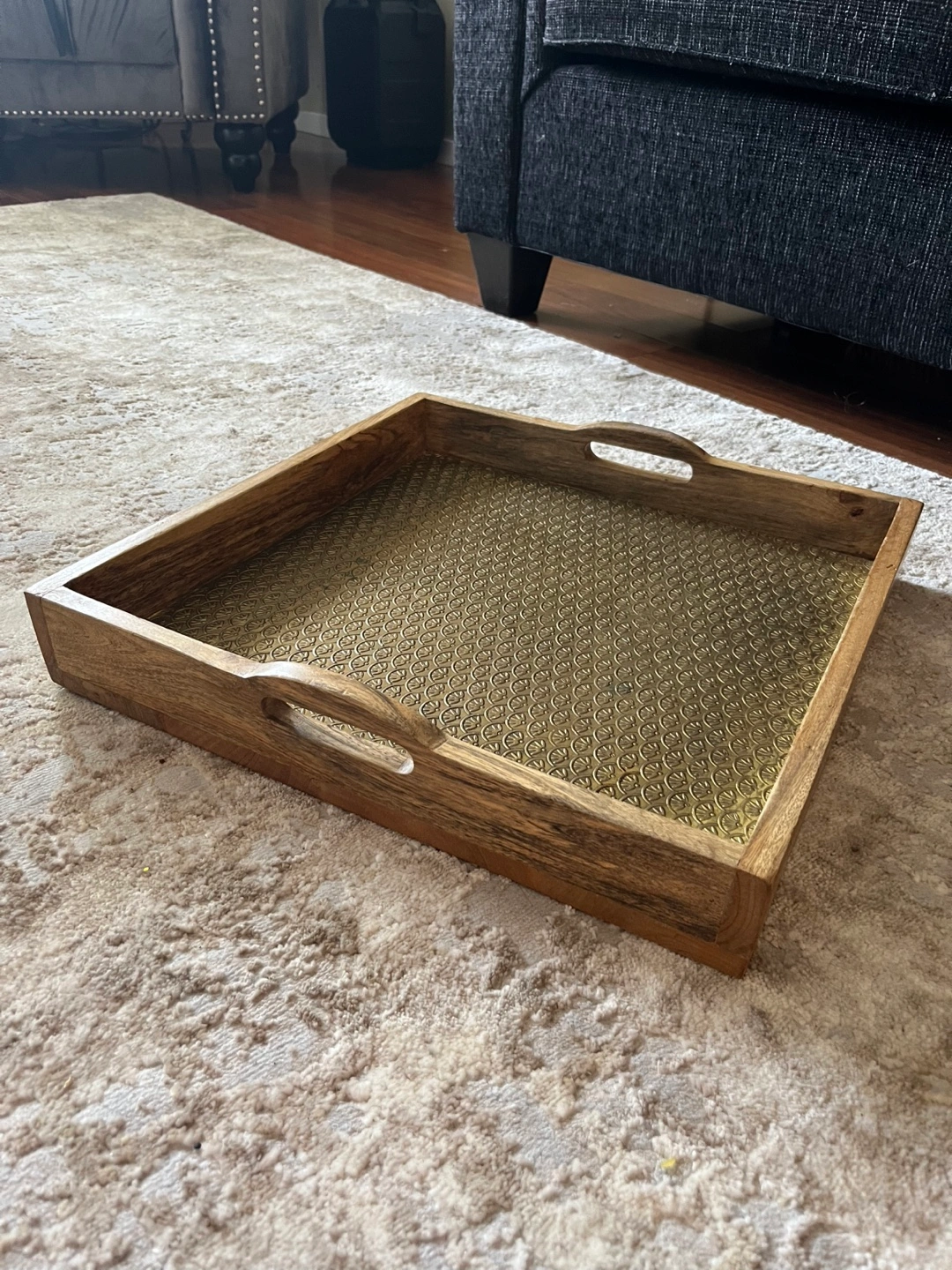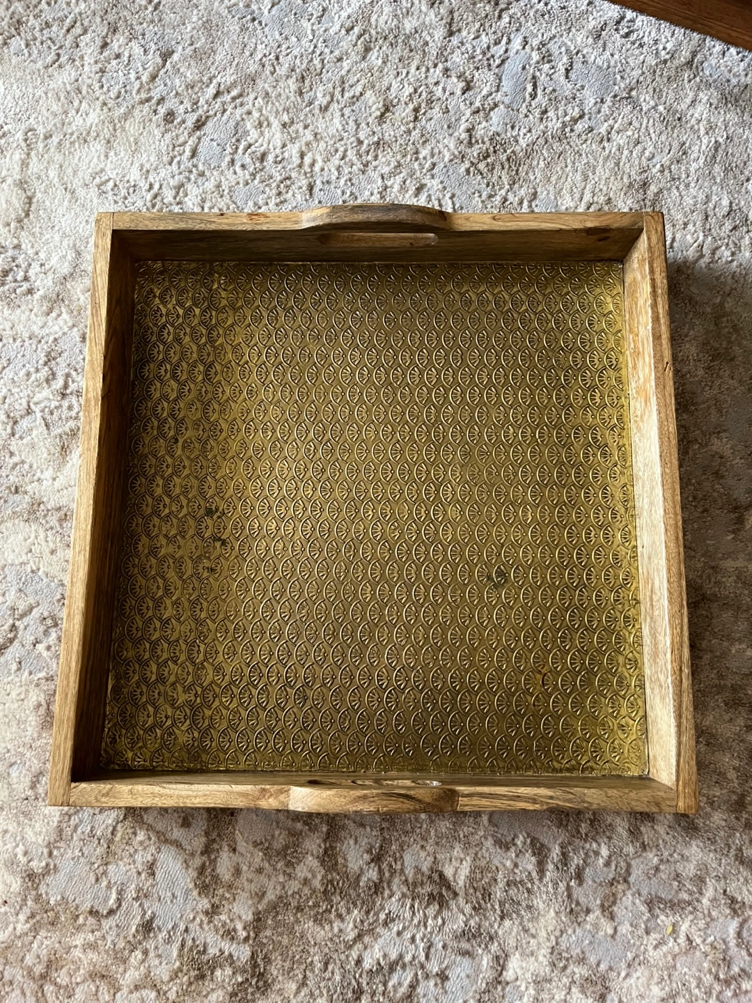 Selling a gorgeous solid wood tray that featuries a unique brass pattern! It's perfect for your coffee table, serving snacks or adding a touch of elegance to your home decor. The tray has convenient handles for easy carrying and is in great condition. It's a stylish and functional piece!