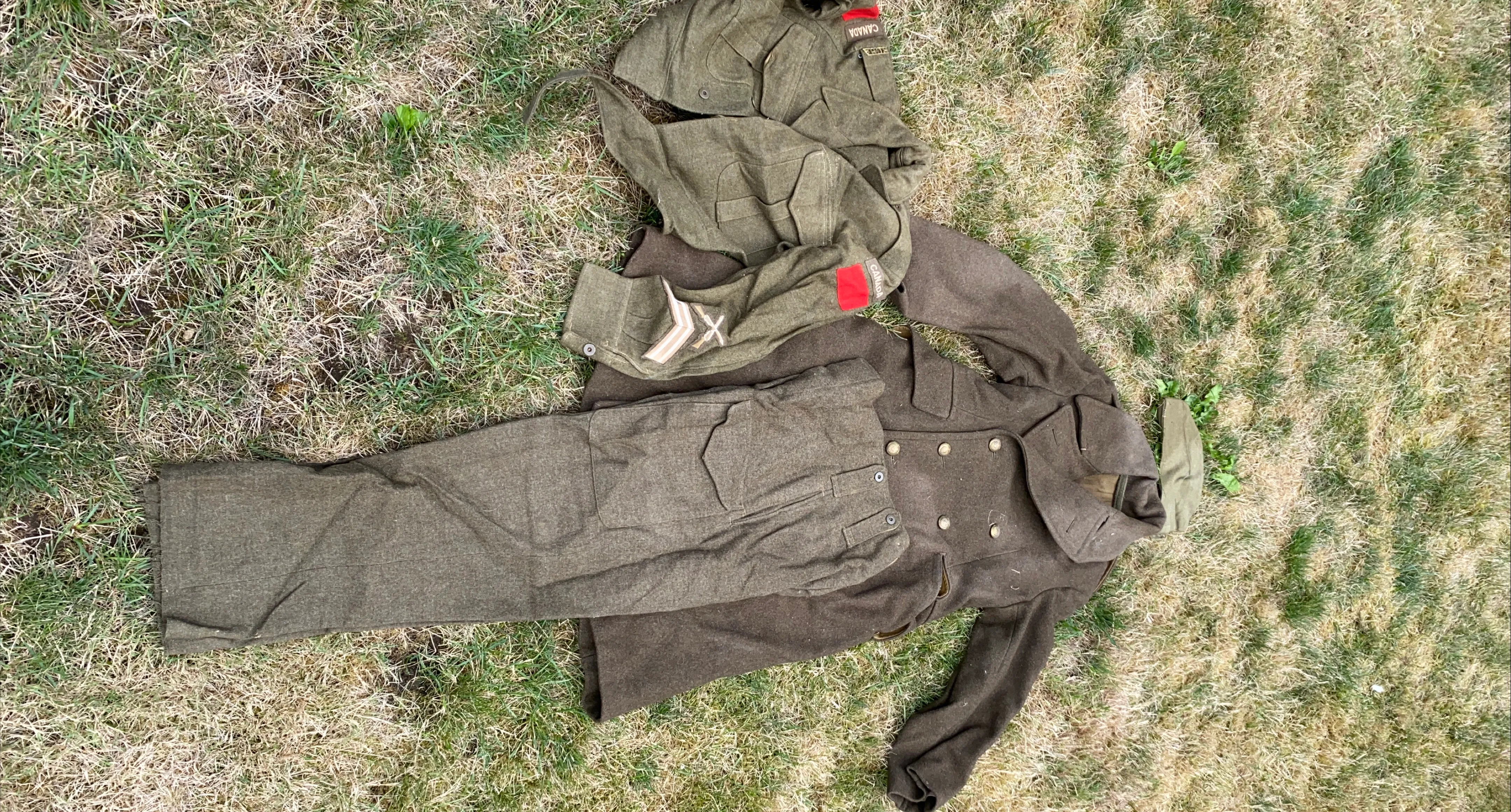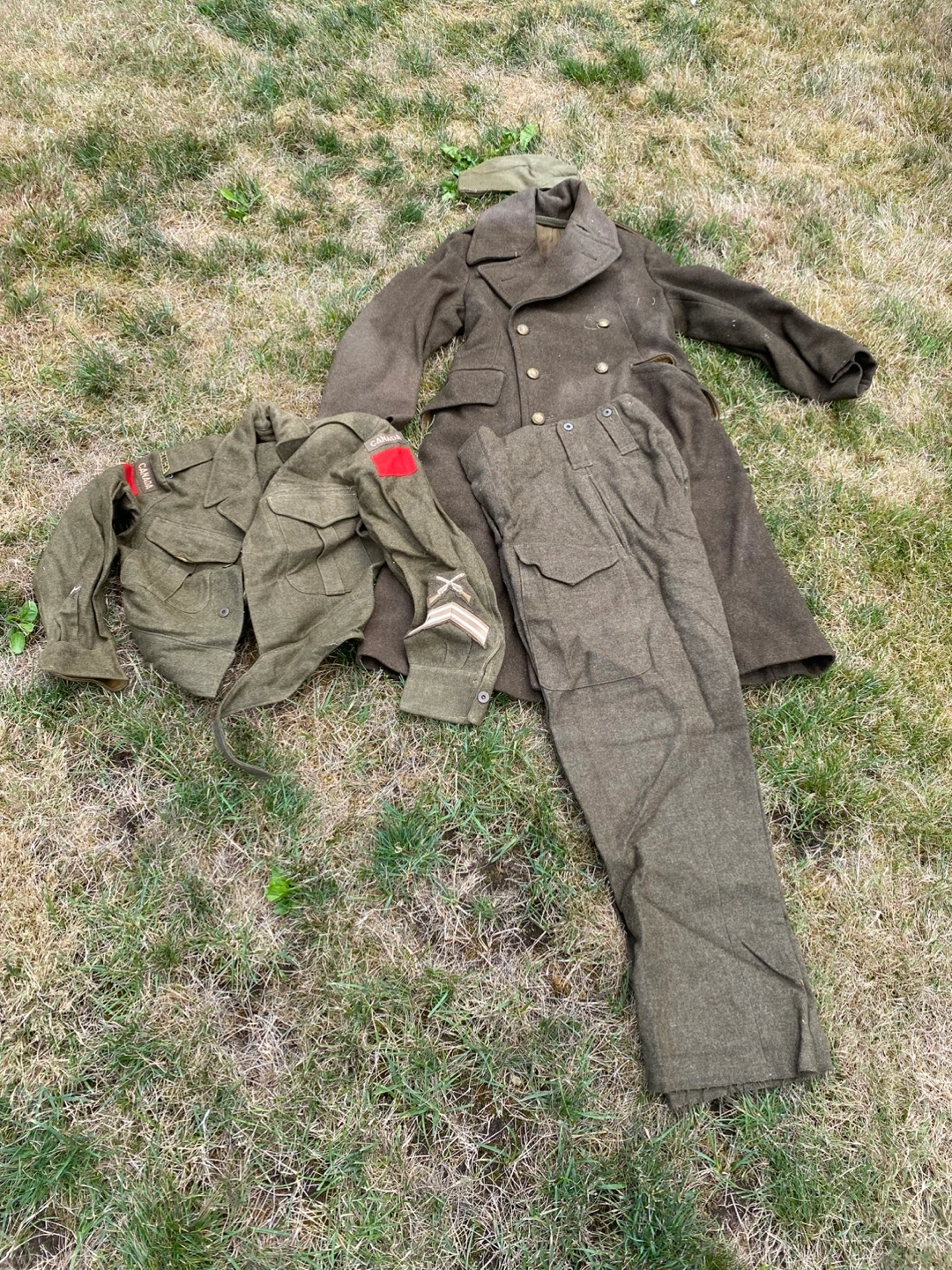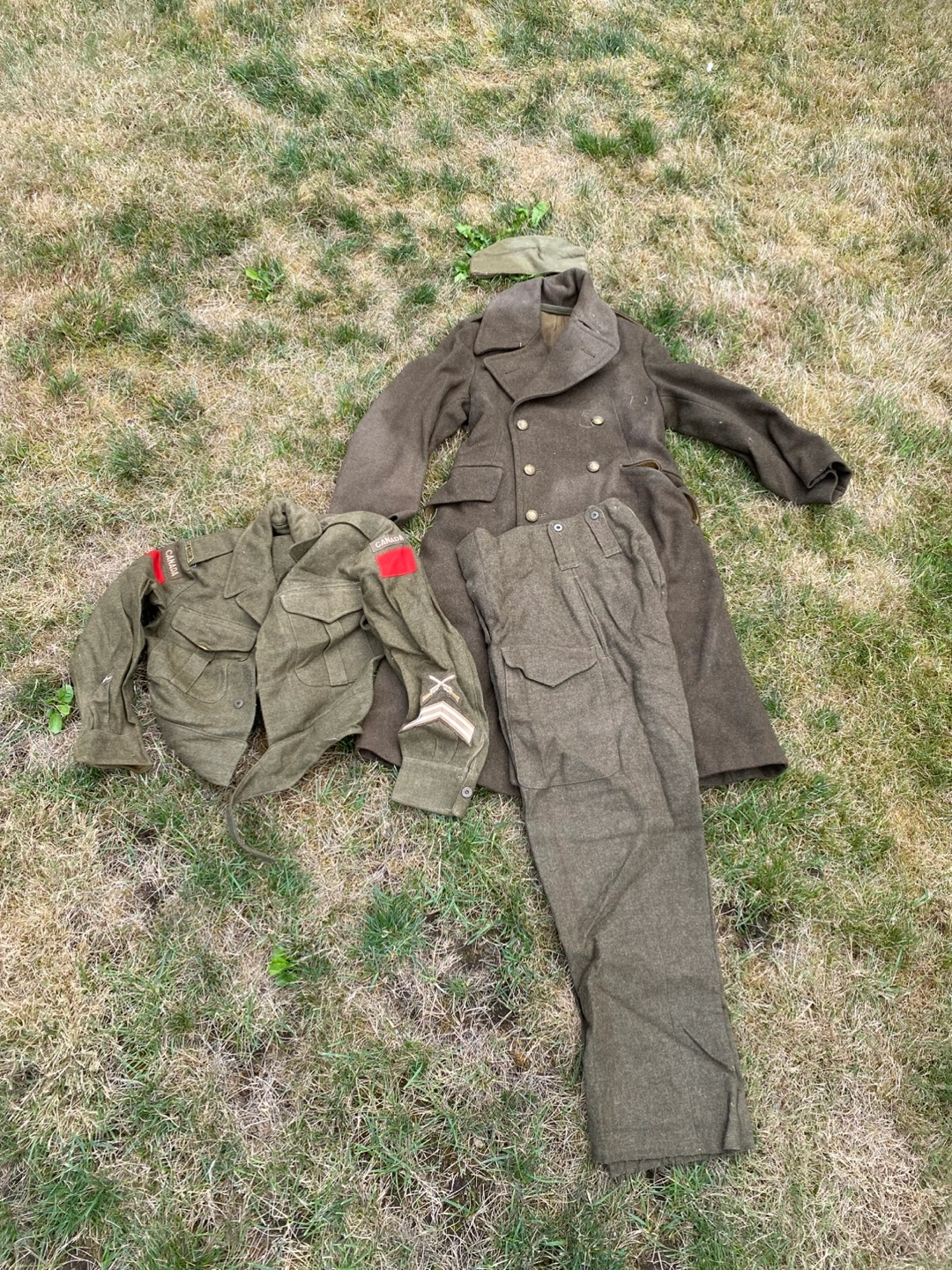 Selling a vintage military uniform set. Includes a coat, jacket, pants, and cap. The set is in used condition with some signs of wear. Great for collectors or reenactors!