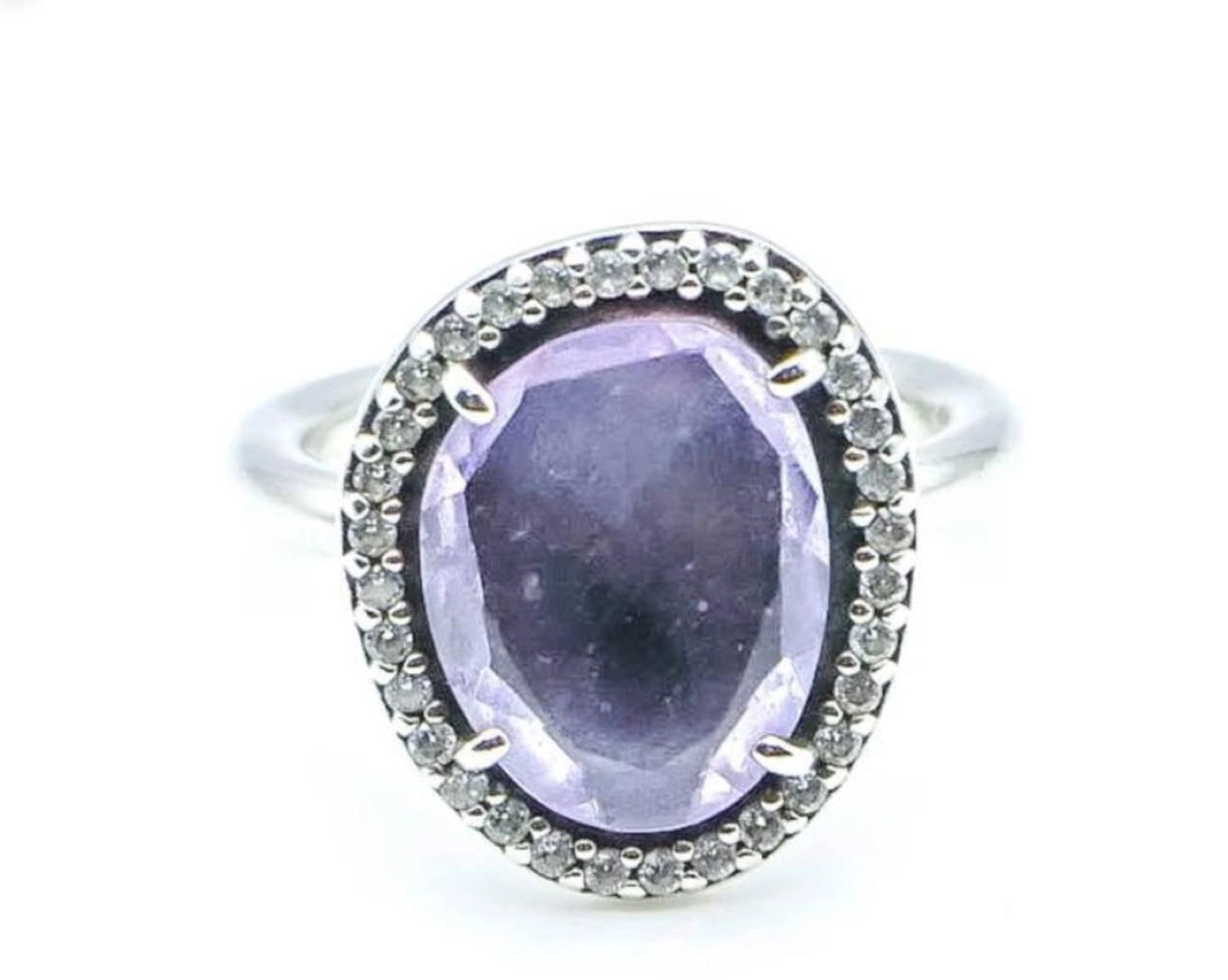 Selling a beautiful Pandora ring featuring a purple oval Amethyst stone surrounded by smaller clear stones. It's in great condition and ready for a new home!