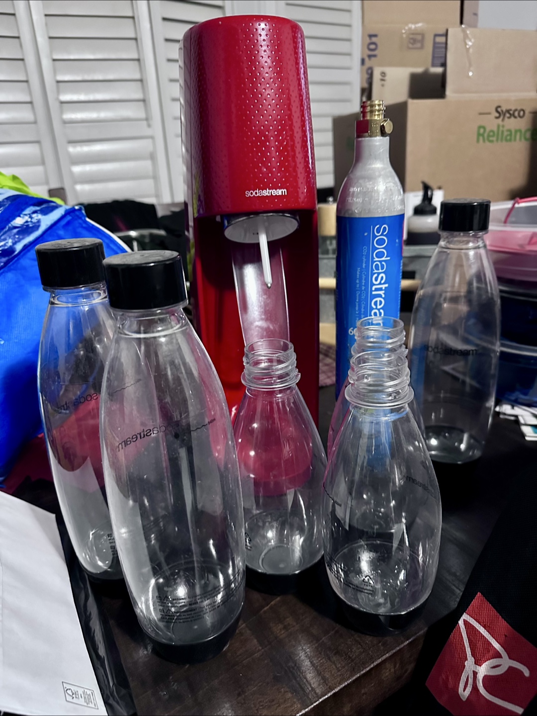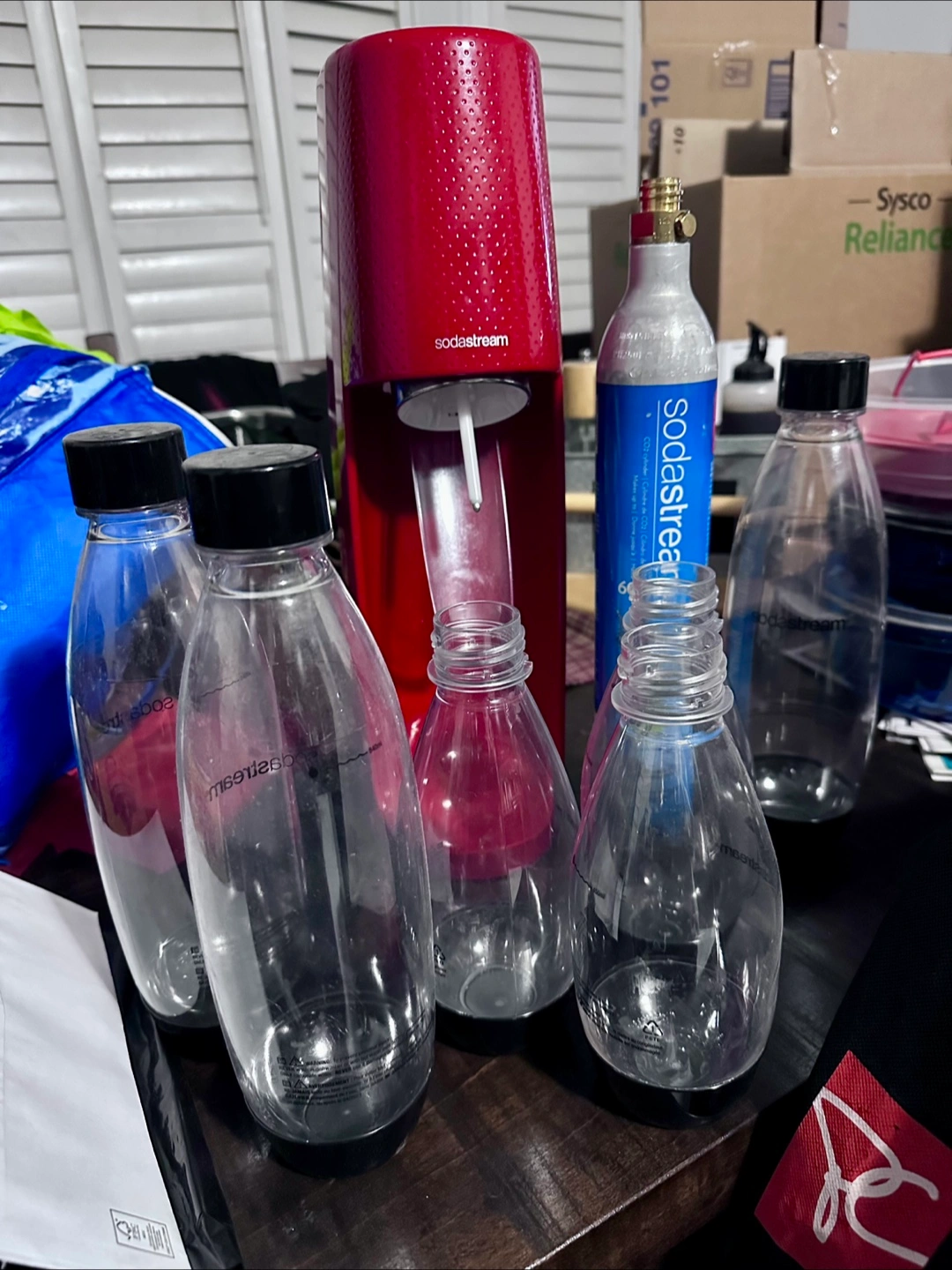 Selling a SodaStream sparkling water maker in red, complete with a CO2 canister and 3 1L and 3 500 ml reusable bottles. In excellent used condition.