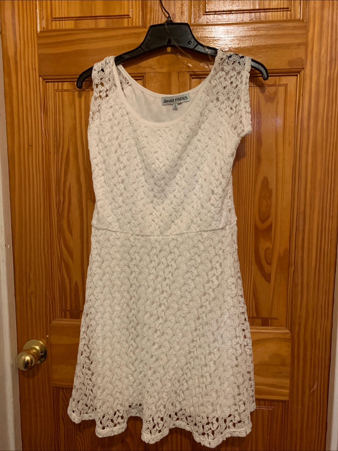 111This is a cute white lace dress from Almost Famous in size L. It's perfect for a casual outing or a summer event. The dress is in great condition.