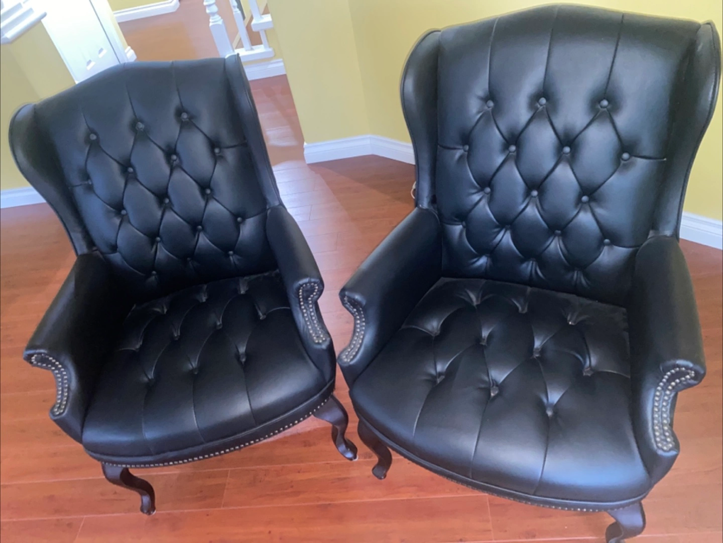 Selling a set of two classic black leather wingback chairs ($25 each).