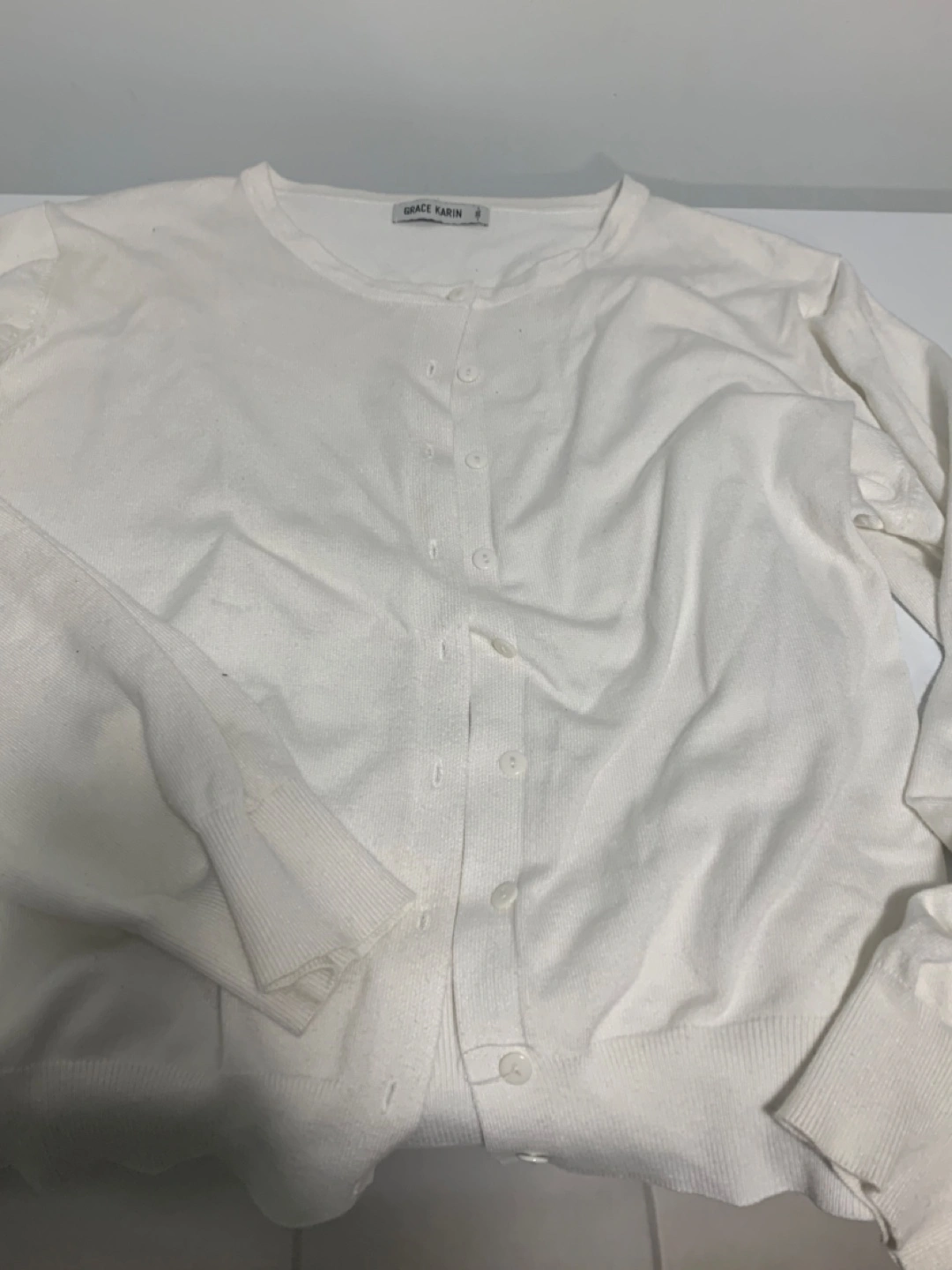 A lovely white cardigan from Grace Karin in size 3XL! It's a classic piece that can be dressed up or down. Perfect for layering or wearing on its own. It's in great condition and ready for a new home!