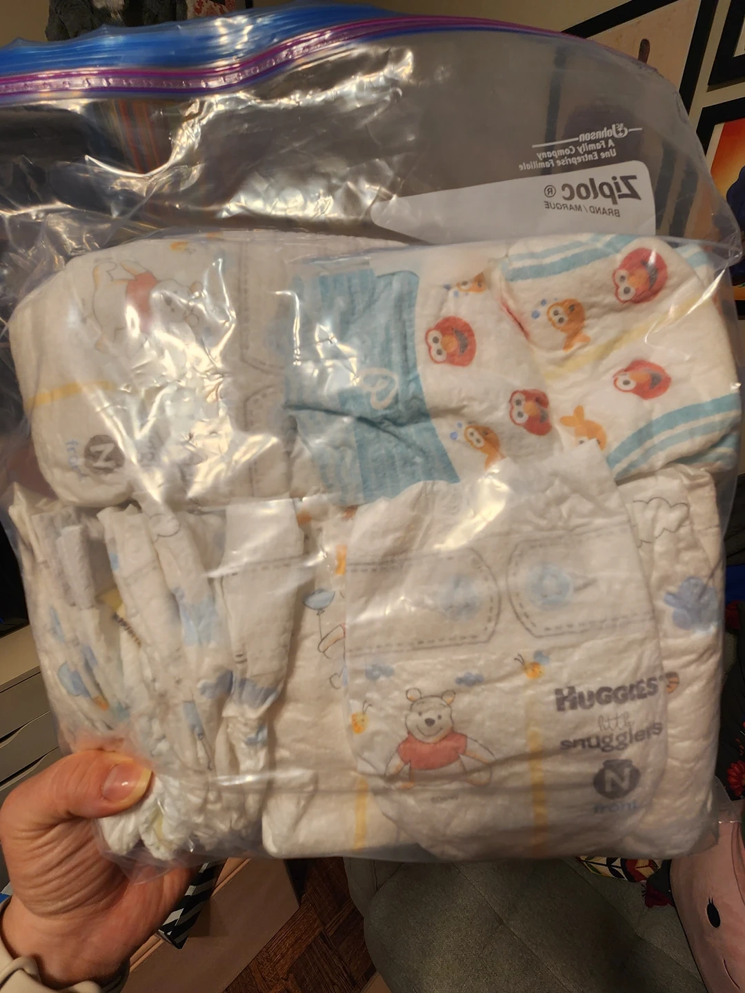 Baby moved to to size 1s and we had some newborns left in the change table & the diaper bag. Approximately 22 Huggies and 3 Pampers.