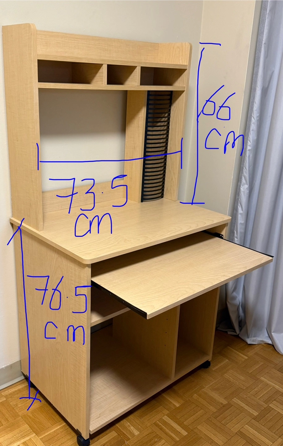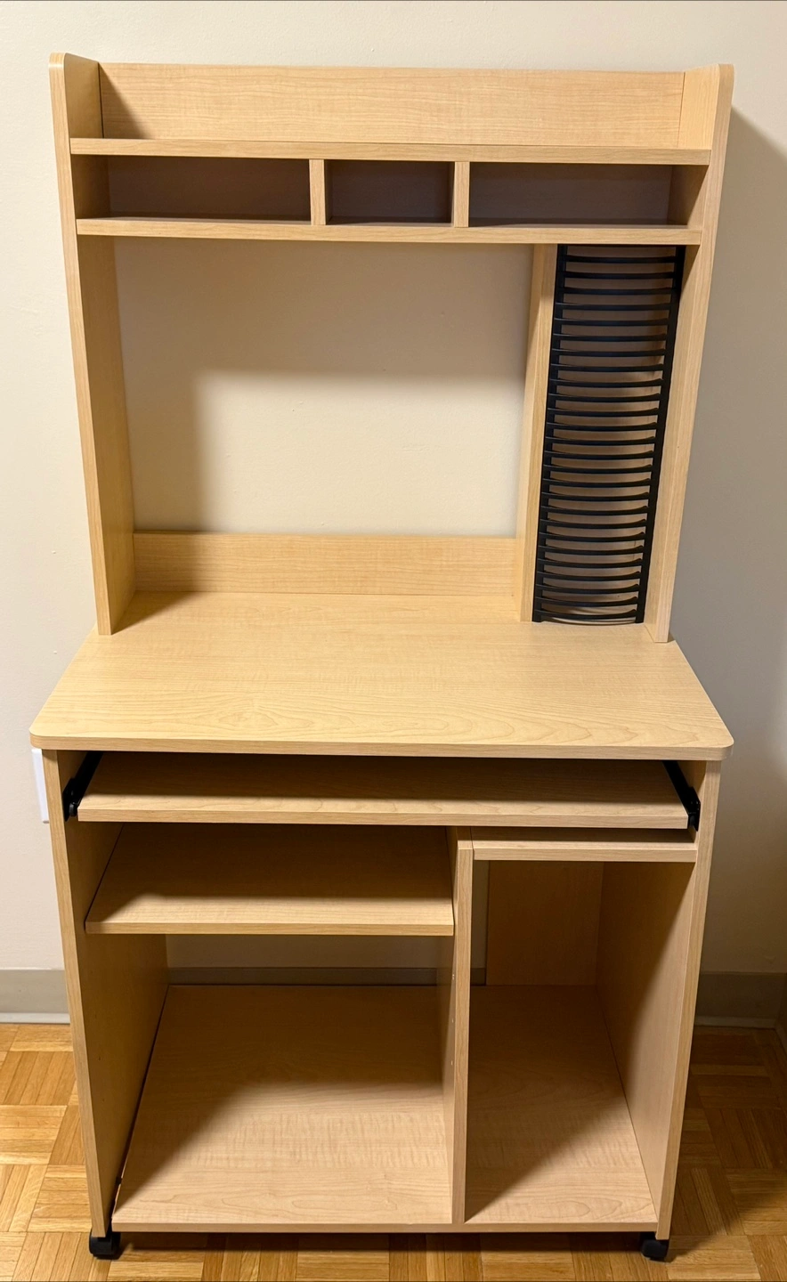 Selling a light wood desk with a hutch. It has a keyboard tray and some shelving.