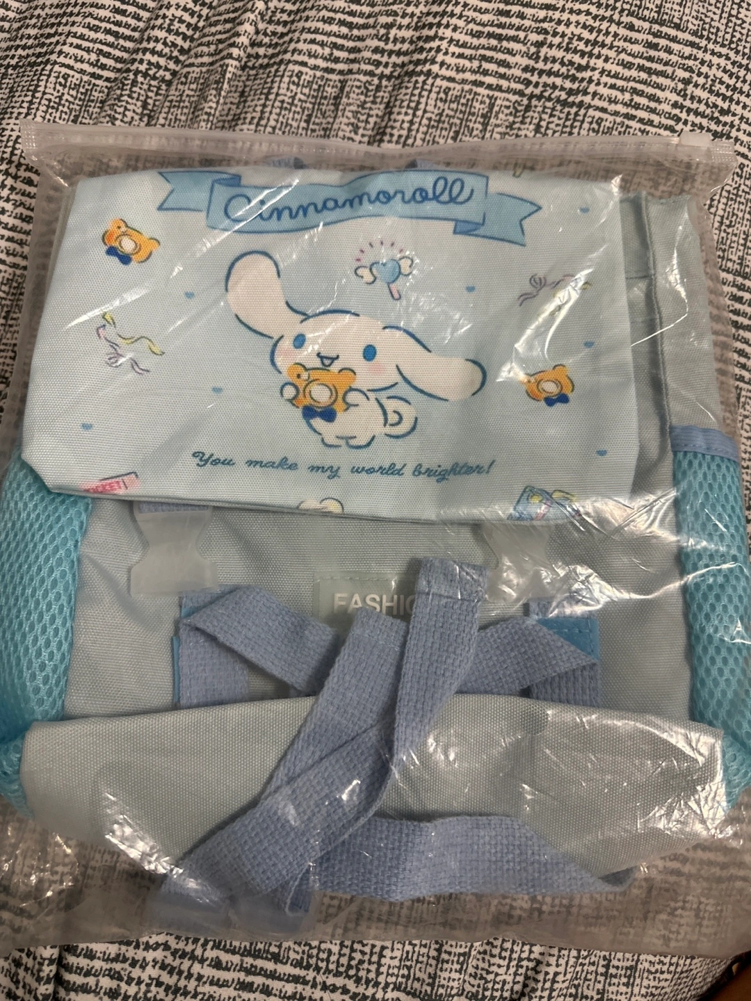 brand new Cinnamoroll backpack for sale! It's light blue and features Cinnamoroll. It also has mesh pockets on the sides. Perfect for adding a touch of cuteness to your kid’s school/everyday attire.