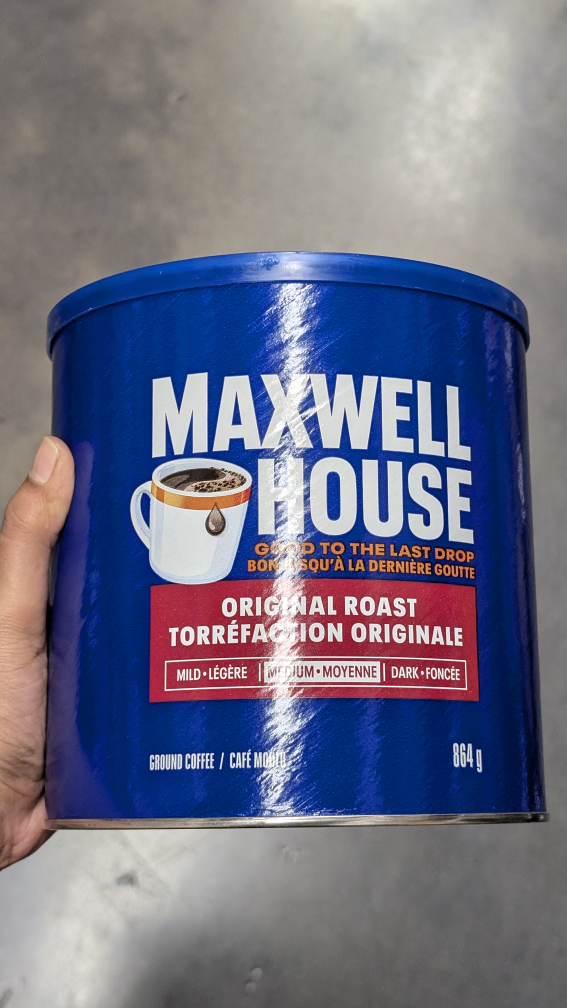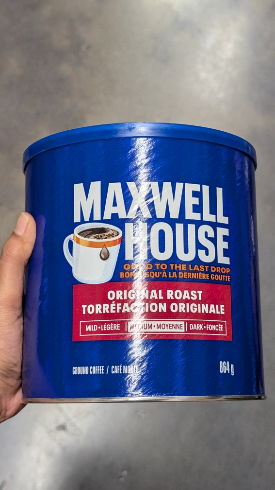 Selling a can of Maxwell House Original Roast ground coffee. It's an 864g can of ground coffee, perfect for your morning brew! It's the original roast, offering a balanced flavour profile.