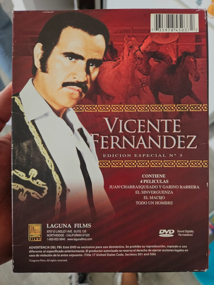 Selling a Vicente Fernandez Edicion Especial N 5 DVD. It contains 4 movies: Juan Charrosqueado y Gabino Barrera, El Sinverguenza, El Macho, and Todo un Hombre. Sound Digitally Re-mastered