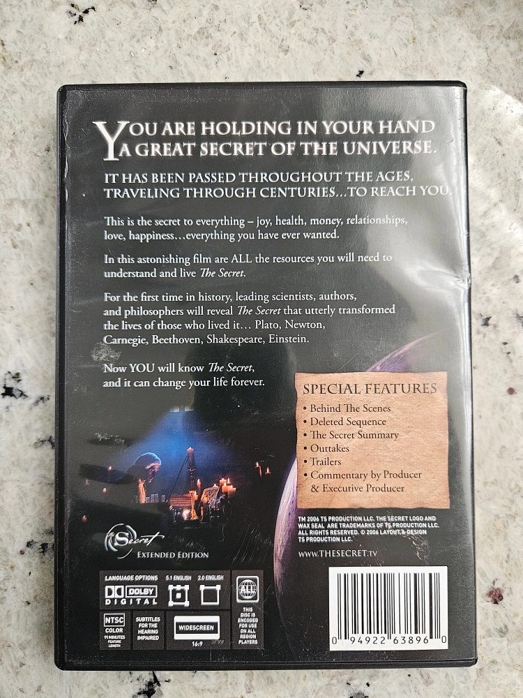 Selling a copy of The Secret DVD, Extended Edition. It includes special features like behind-the-scenes footage, deleted sequences, the summary, outtakes, and trailers. You'll also find commentary by the producer and executive producer