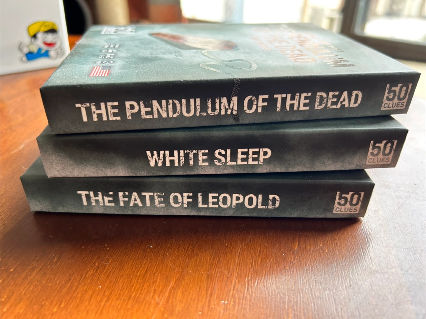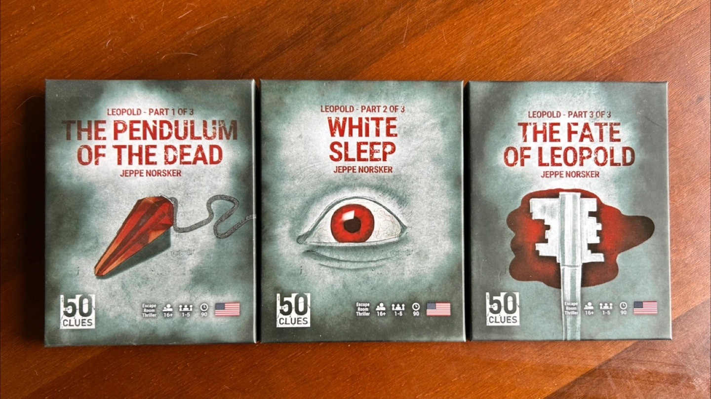Selling a set of 50 Clues escape room thriller games! This includes Leopold Part 1 of 3: The Pendulum of the Dead, Leopold Part 2 of 3: White Sleep, and Leopold Part 3 of 3: The Fate of Leopold. Each game is designed for 1-5 players and takes about 90 minutes to play. Recommended for ages 16+