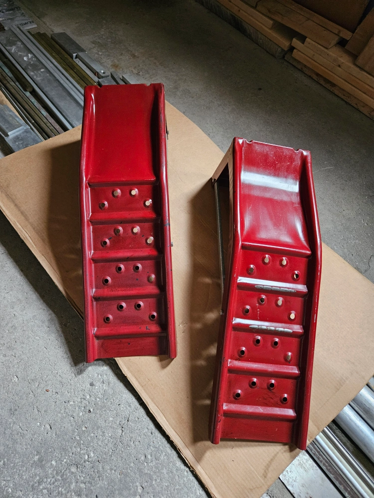 Selling a pair of red metal car ramps, steps. They show signs of use, as pictured, but are still new only used once sturdy and functional. Great for adding easy access to your car.