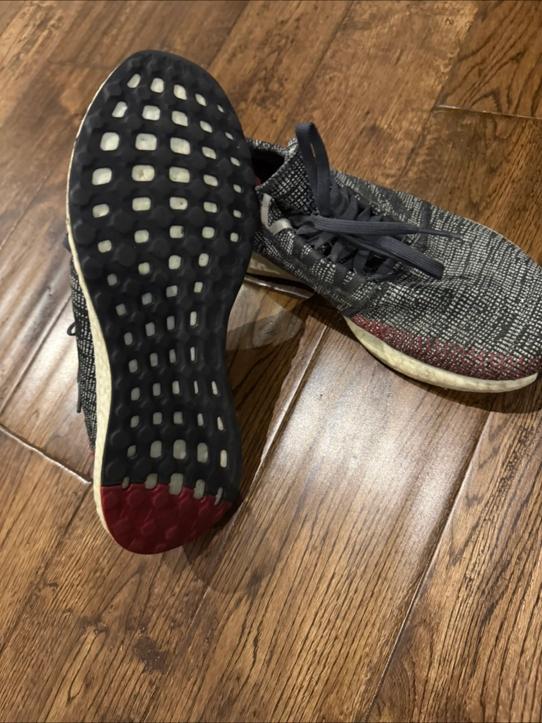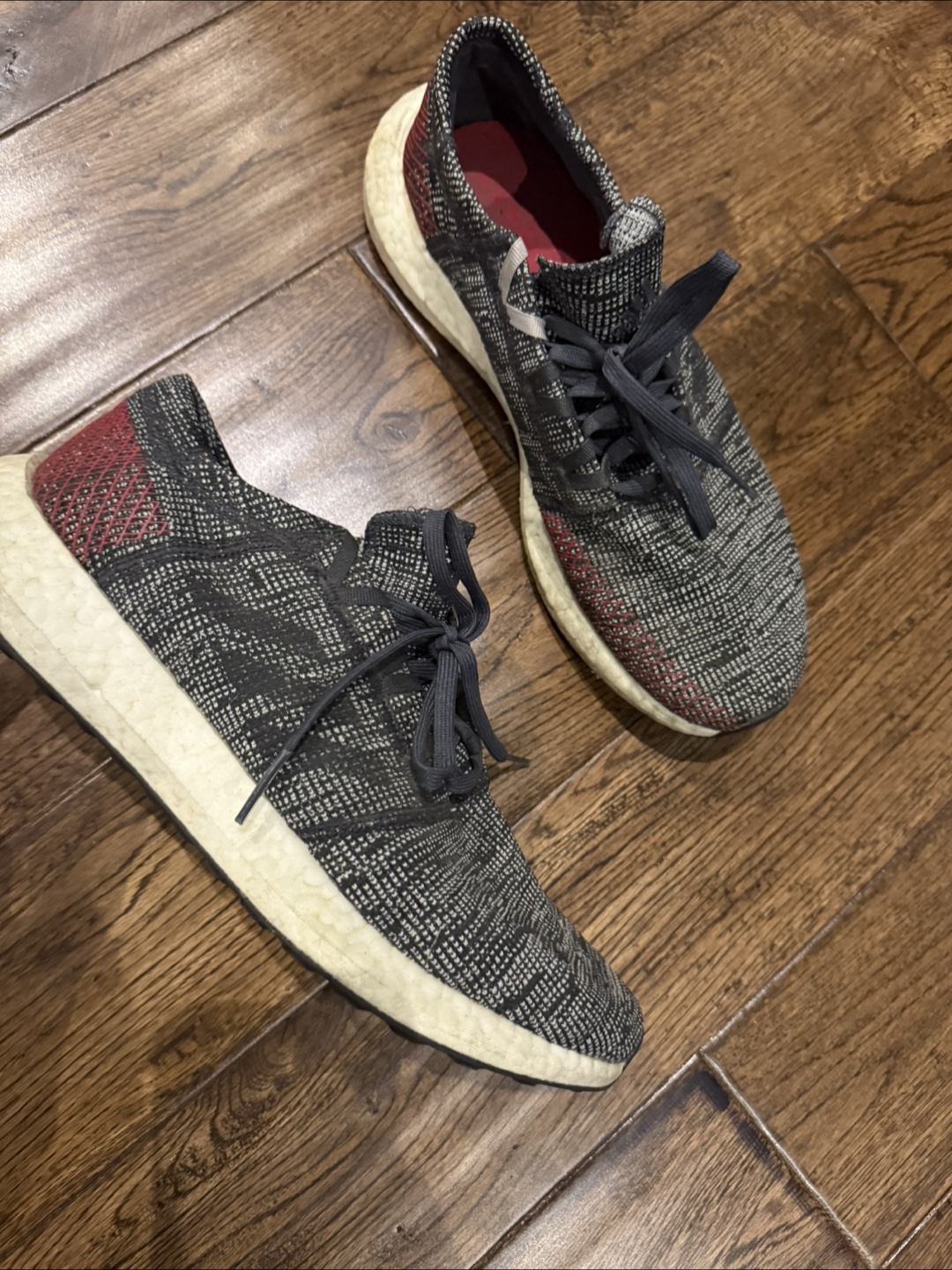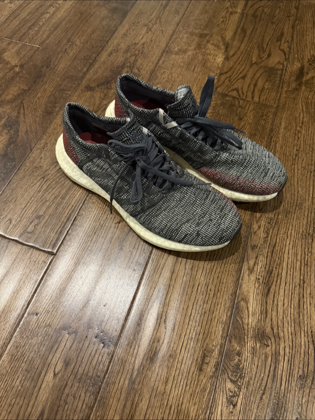 Selling a pair of Adidas Pureboost shoes in size 10.5 US. They're in great condition with some signs of wear. Great for running or casual wear!