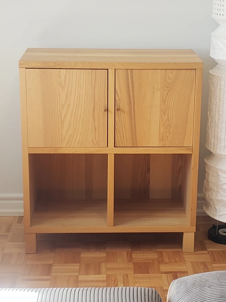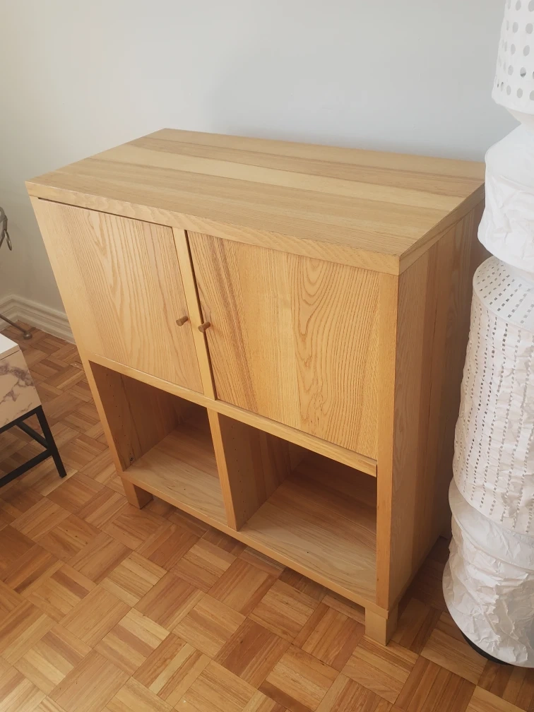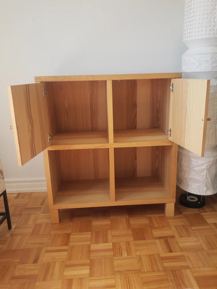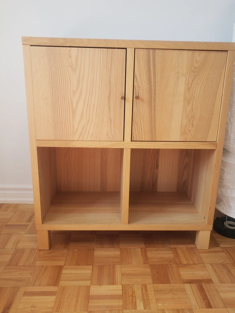 Here's a lovely wooden cabinet that could be perfect for extra storage in your home! It features two doors on top and open shelving below. The wood has a beautiful, natural grain. It's in great shape and ready for a new home. You can use it as a bookshelf, TV stand, and a place to display decor. You can even add baskets in the lower shelves for extra storage and decor. Trying to sell this item to pay back for Father's funeral expenses. Thank you for sharing interest or sharing it to friends and family who may be interested in this unit. Please click on my profile for more lovely furniture. I had back surgery, so can not help with lifting. Sorry for the inconvenience. Please ask someone to help you when picking it up. Cash only please and no e-transfer.