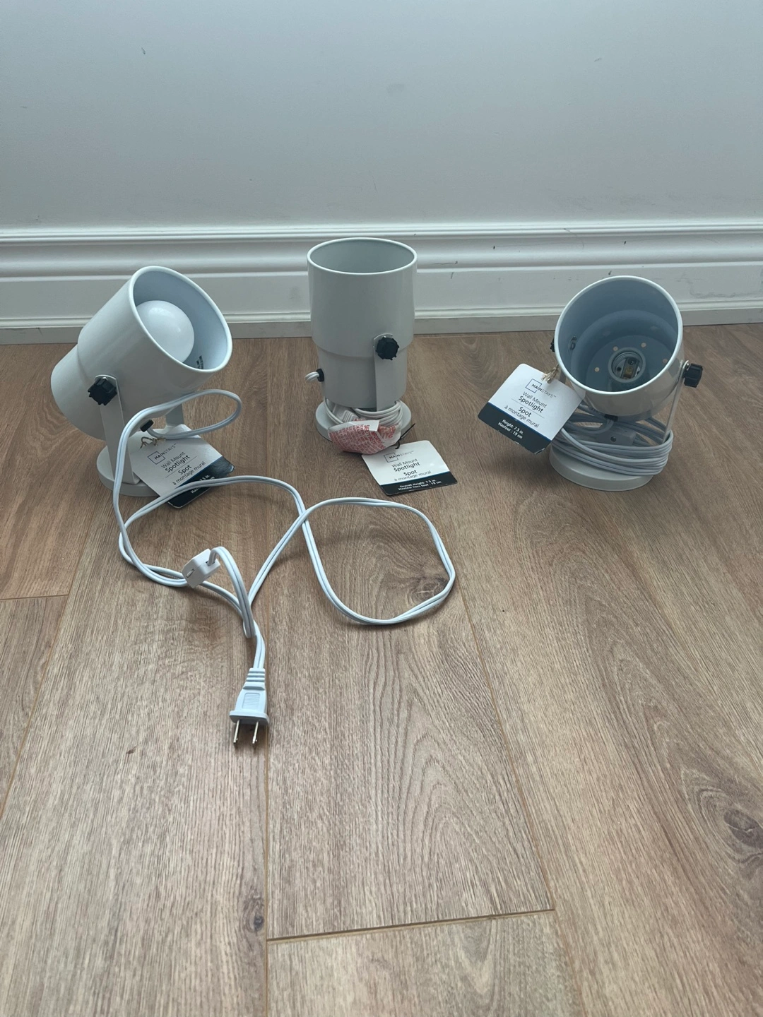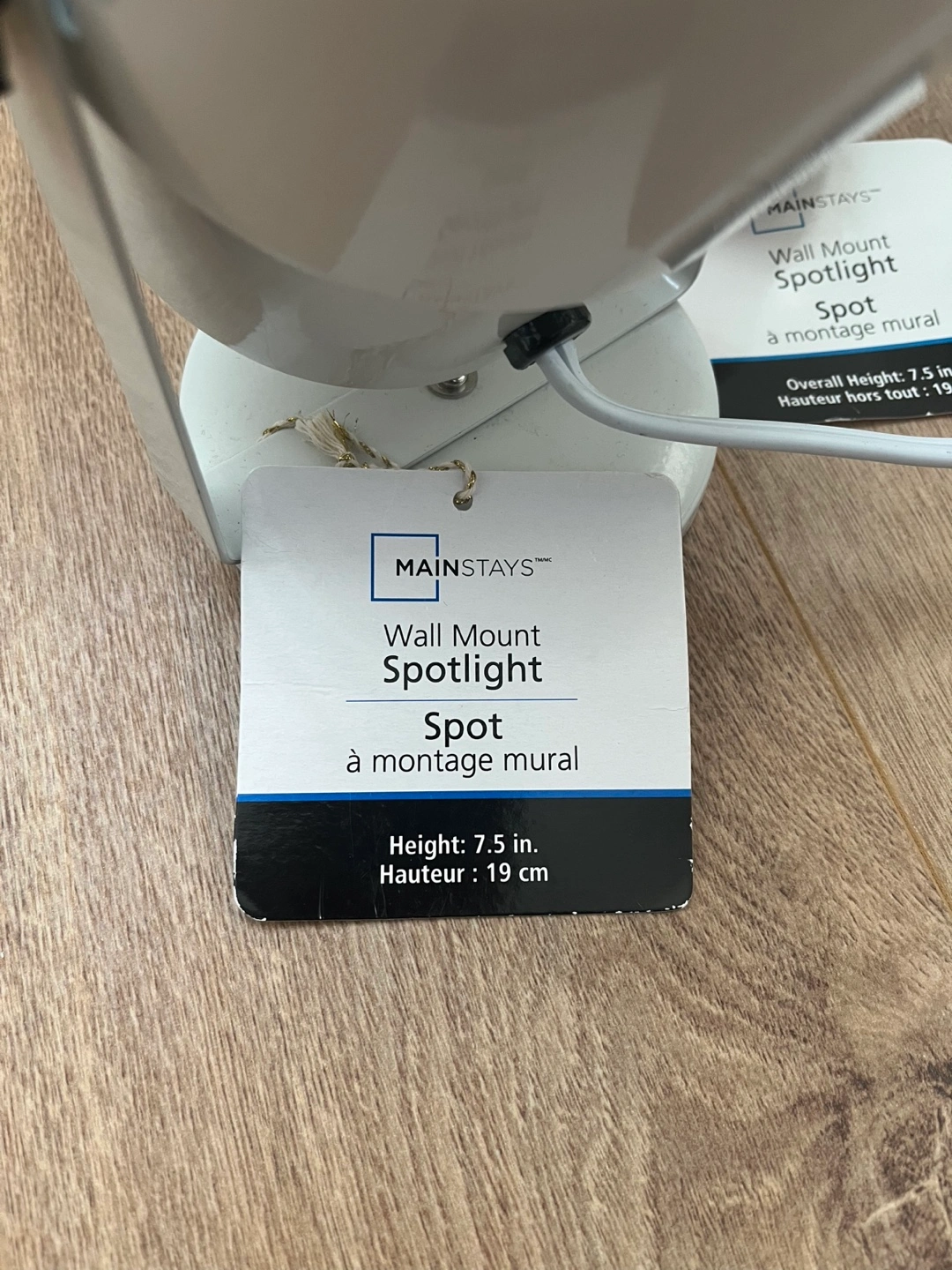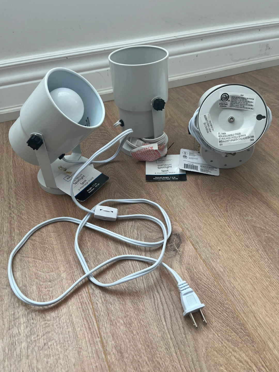 Selling a set of three Mainstays wall mount spotlights. Each spotlight has a height of 7.5 inches (19 cm). Great for adding some directed light to any room!