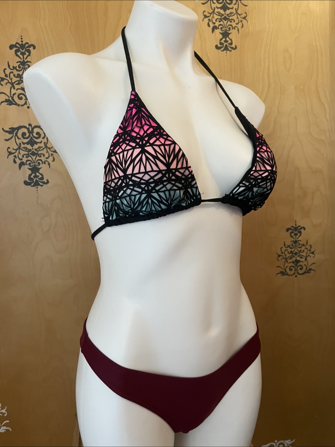 Vintage Y2K Colorful Geometric Bikini Set Triangle Top High Rise Purple Cheeky Bottoms XS/S