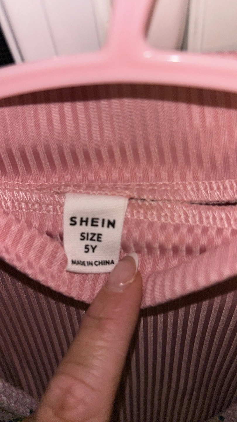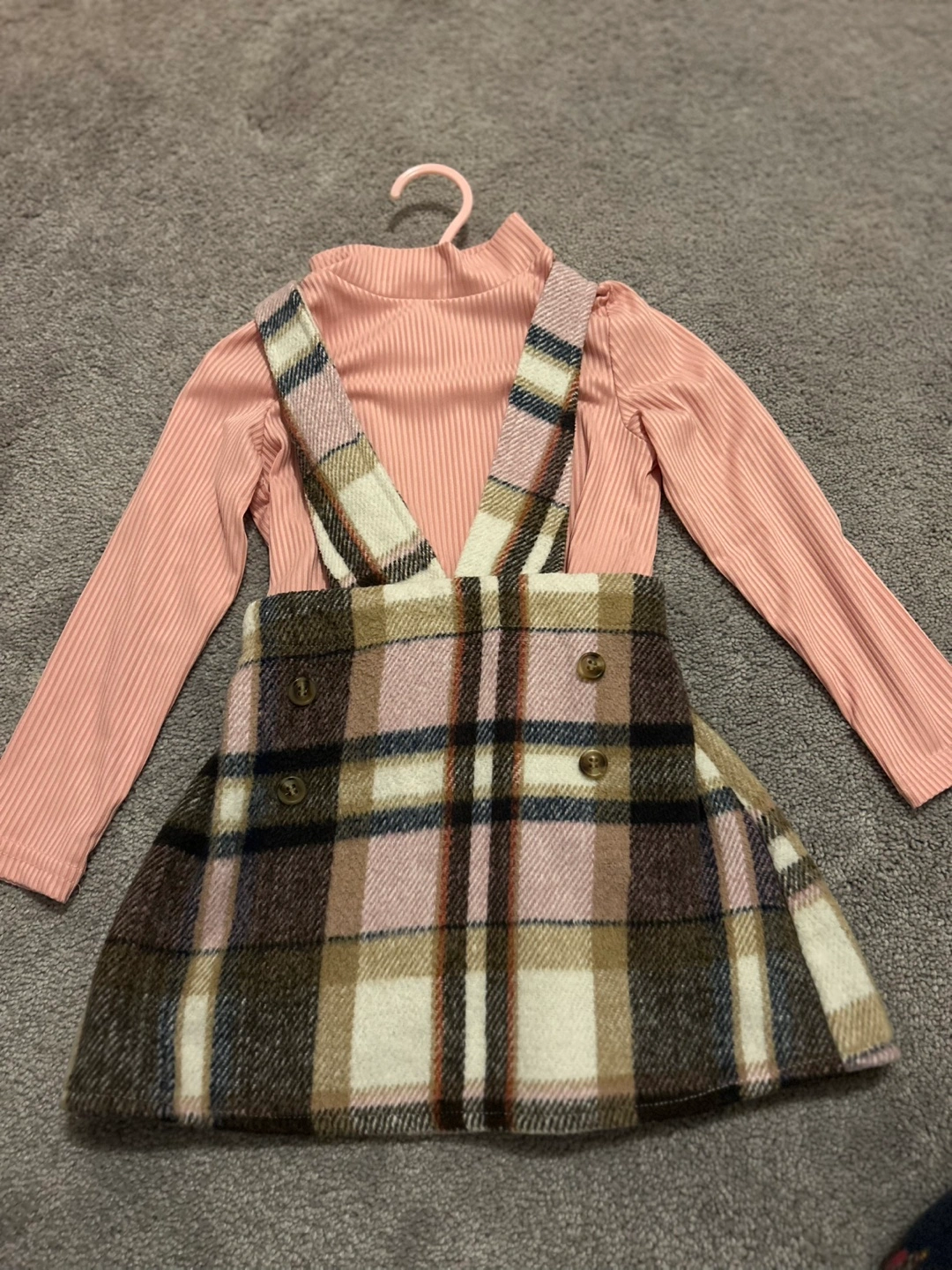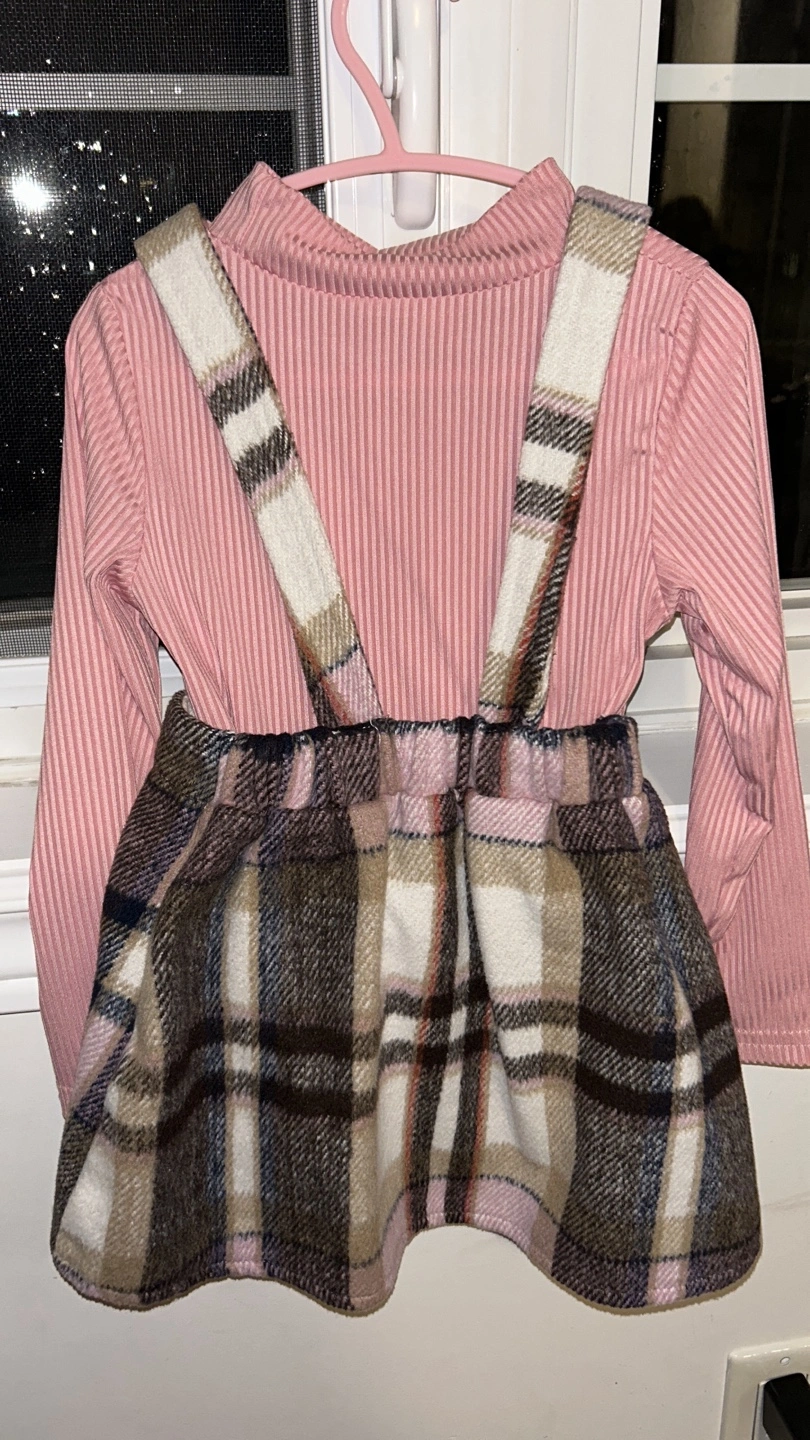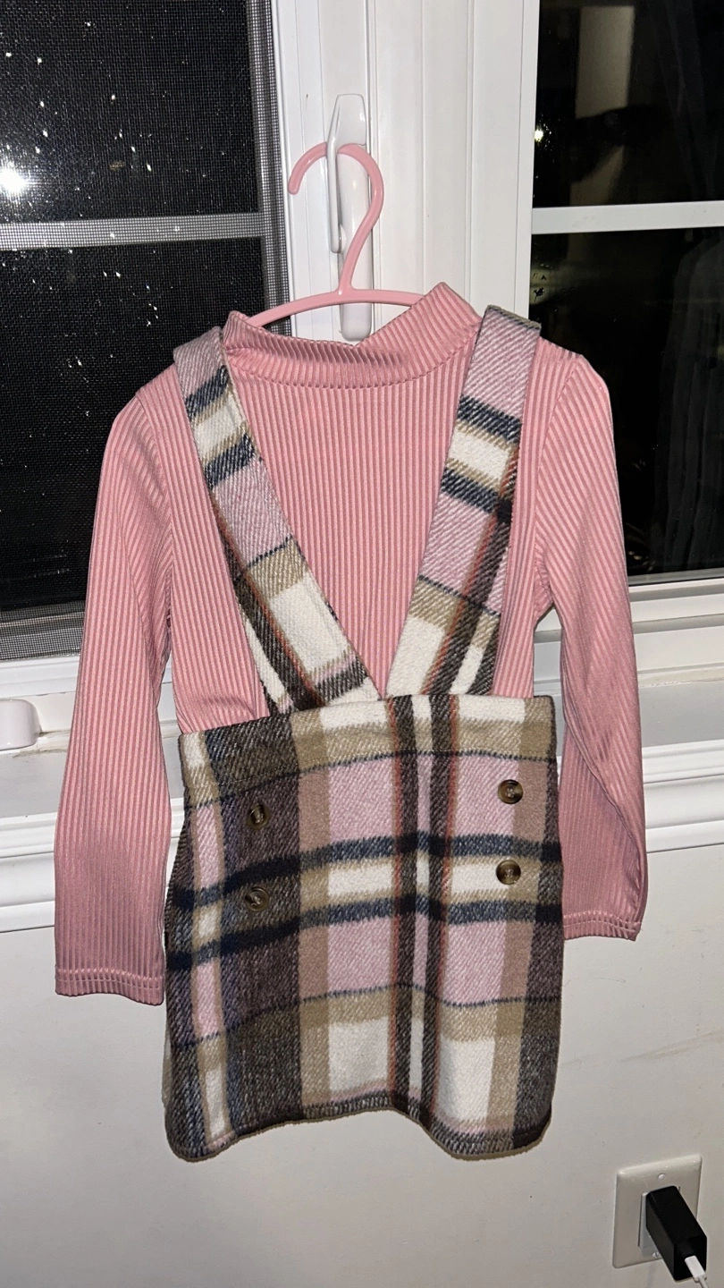 Cute Shein kids outfit in size 5Y. The set includes a long-sleeved, ribbed pink top and a plaid skirt with attached suspenders. Great for your little one!