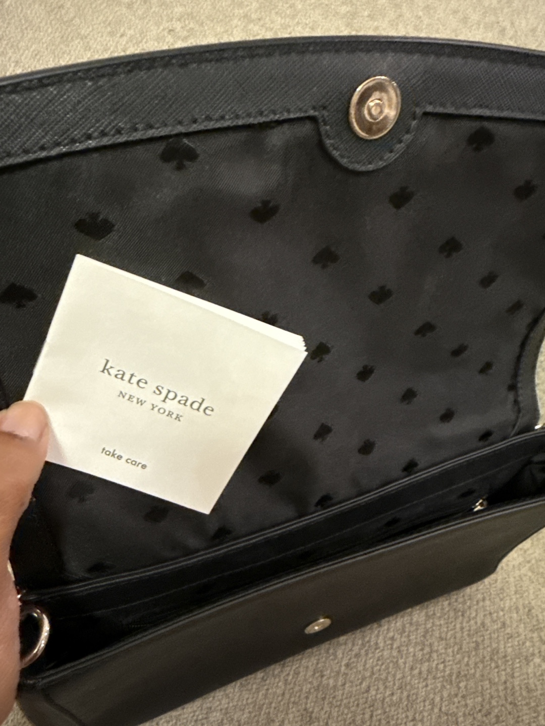 Selling a Kate Spade crossbody bag in black. It's in great condition! The interior has a cute spade pattern, and it comes with a care card. Perfect for everyday use or a night out
