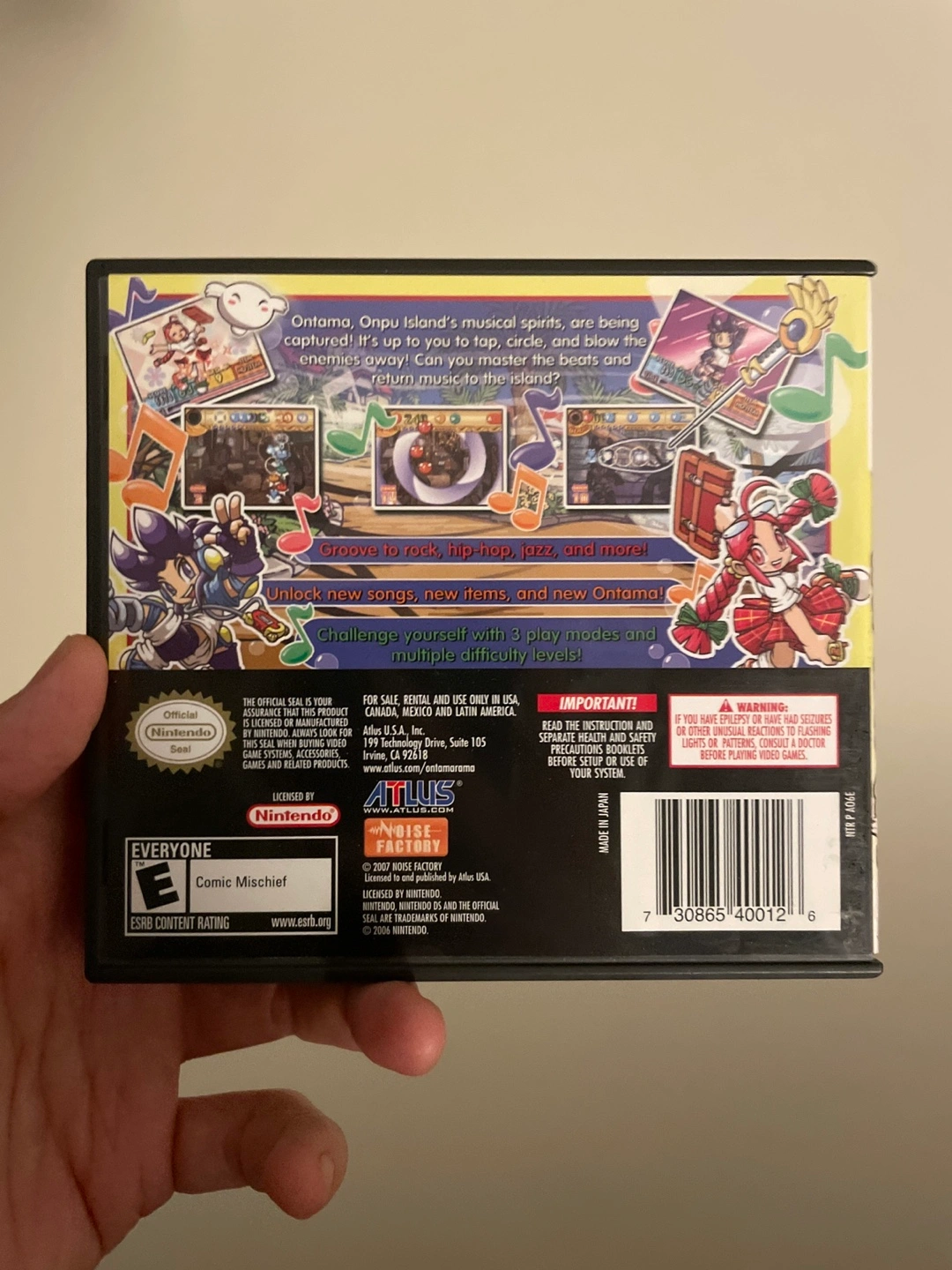 Selling Otomarupa for the Nintendo DS! It's a fun rhythm game where you can master the beats and return music to the island. It includes the game cartridge and instruction booklet in its case. Rated E for Everyone.