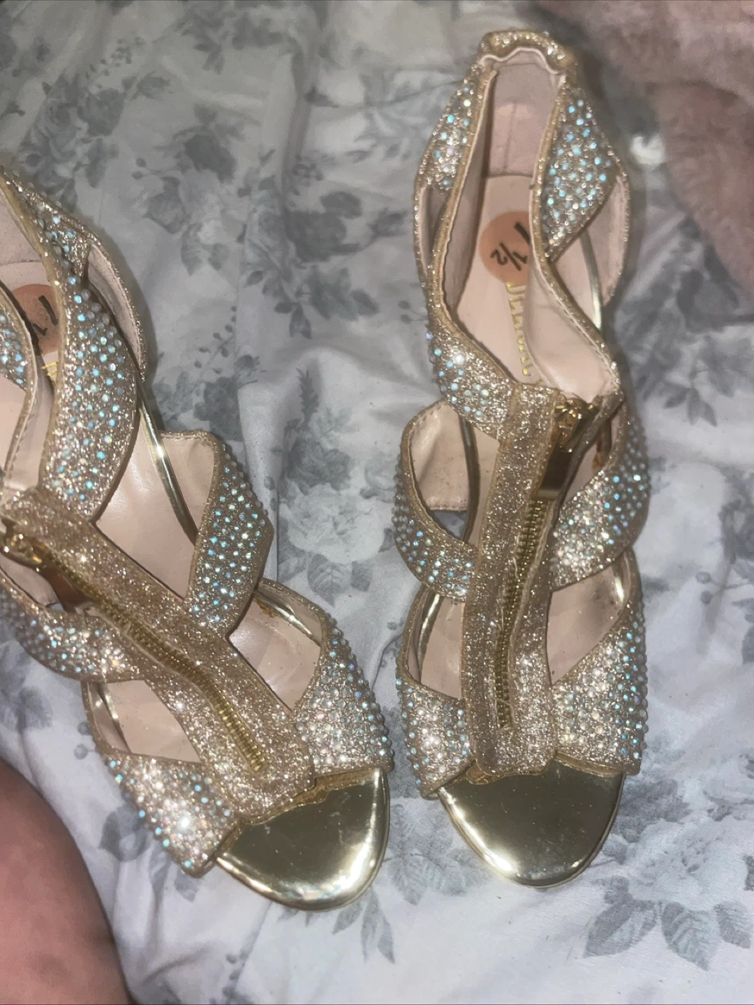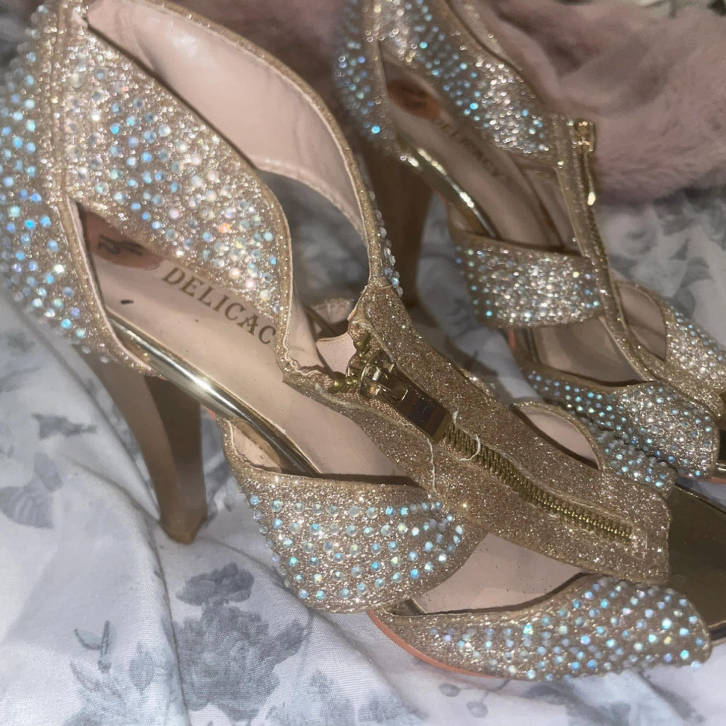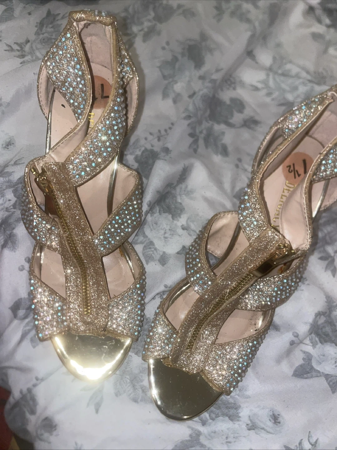 Selling a pair of gold, sparkly Delicacy heels. They are a size 7 1/2. Perfect for a night out!