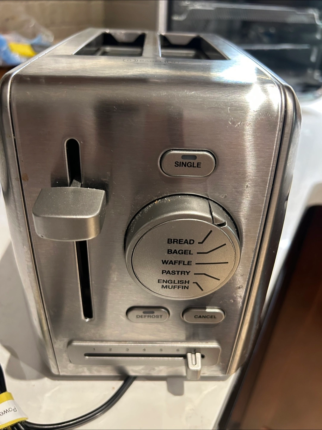 Selling a Cuisinart toaster. It has settings for bread, bagel, waffle, pastry, and English muffin. There's a small dent on the side.