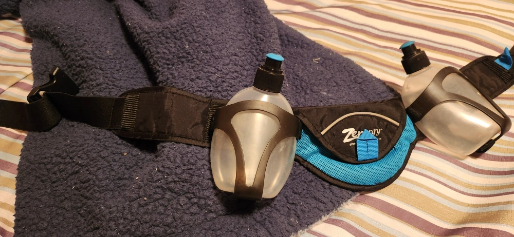 I'm selling a Zenergy hydration belt. It's perfect for running or hiking. It has two water bottle holders and a small pouch for your phone or keys. It's in great condition and ready for your next adventure