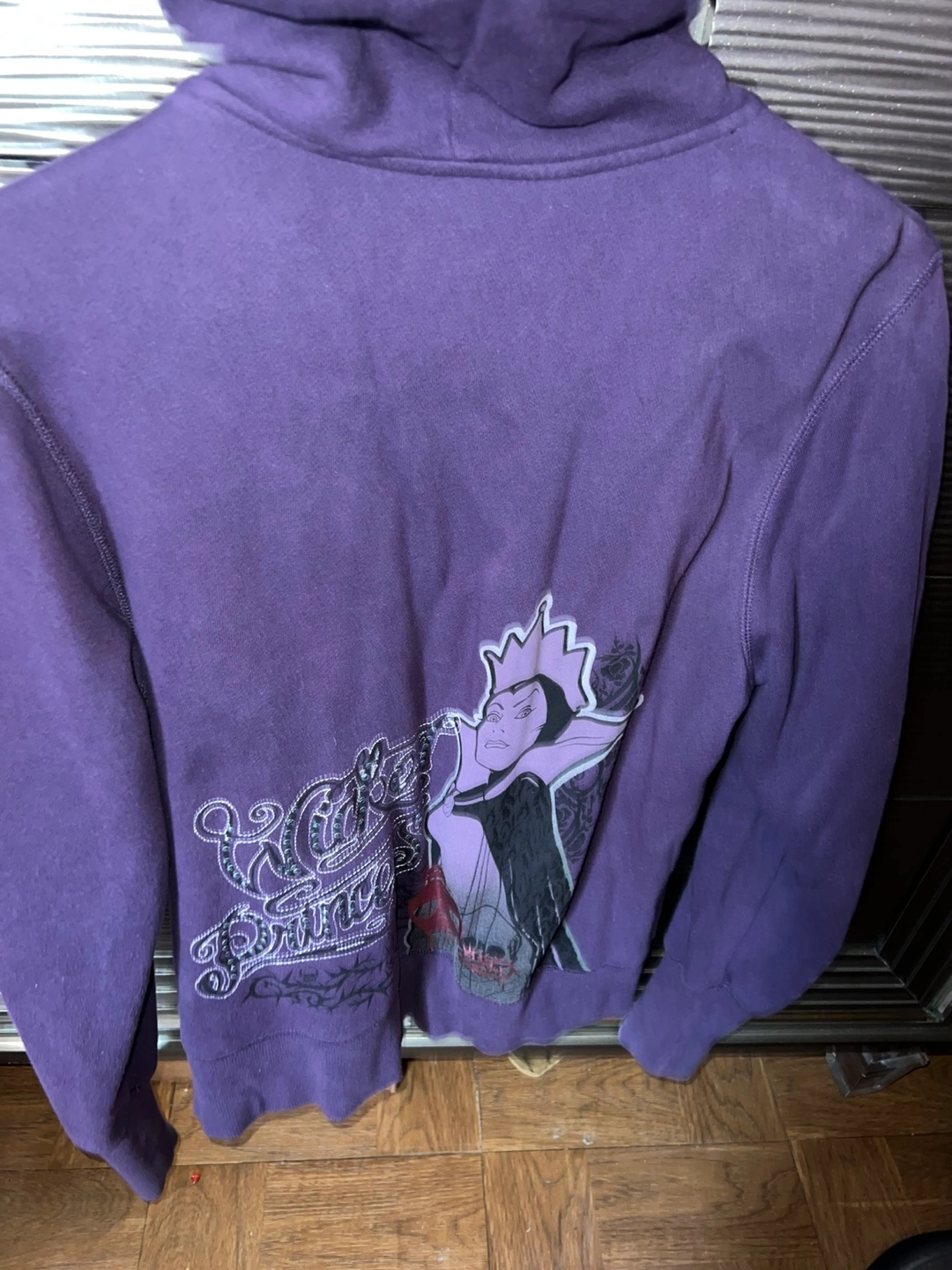 Disney Parks purple zip-up hoodie in size large. Features designs on the front and back. The material is 80% cotton and 20% polyester.