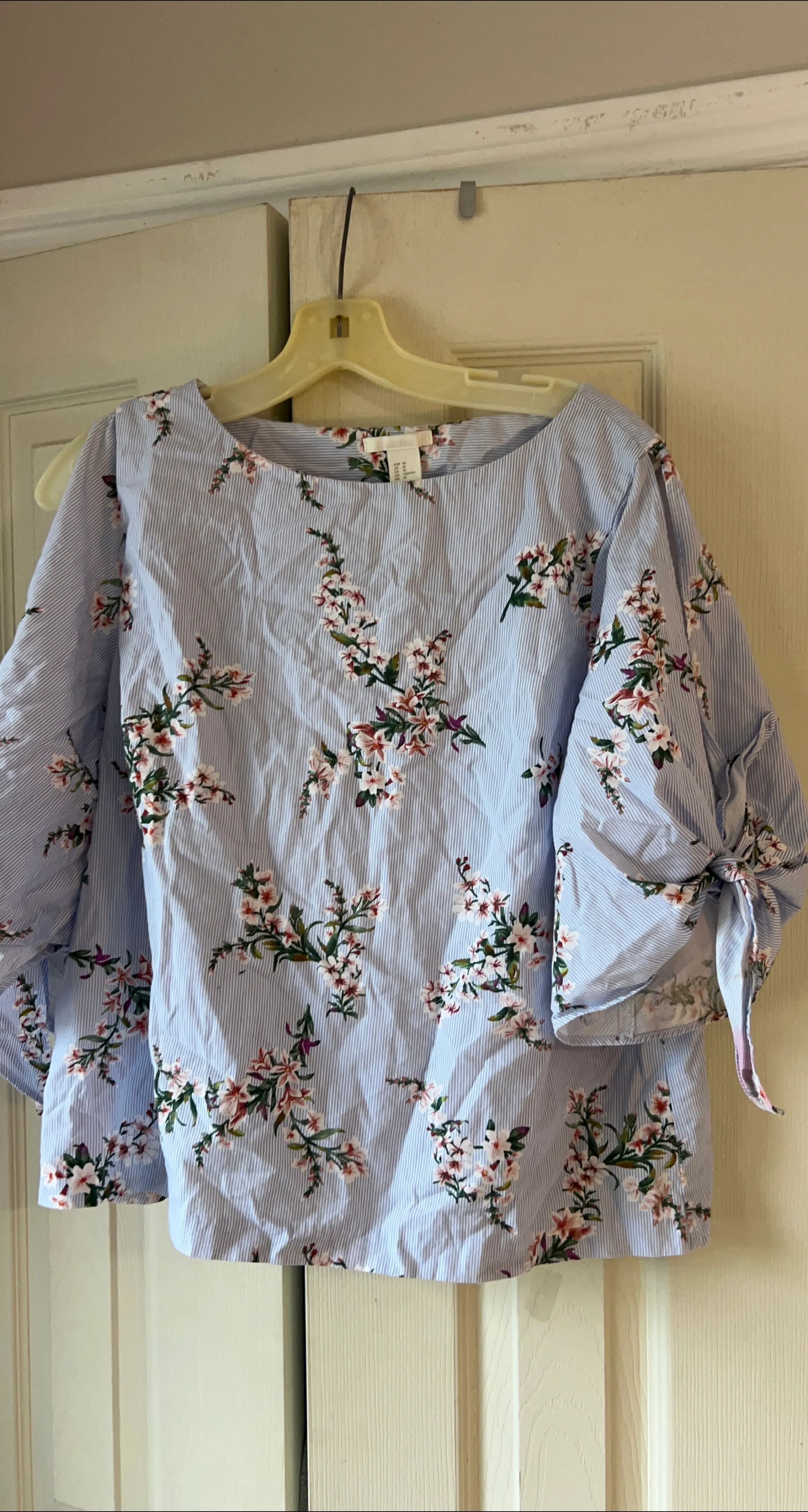 Here's a cute H&M blouse with a floral pattern on a light blue and white striped background. It's a size small and in great condition. The sleeves have a unique tied detail, adding a bit of flair to the design!