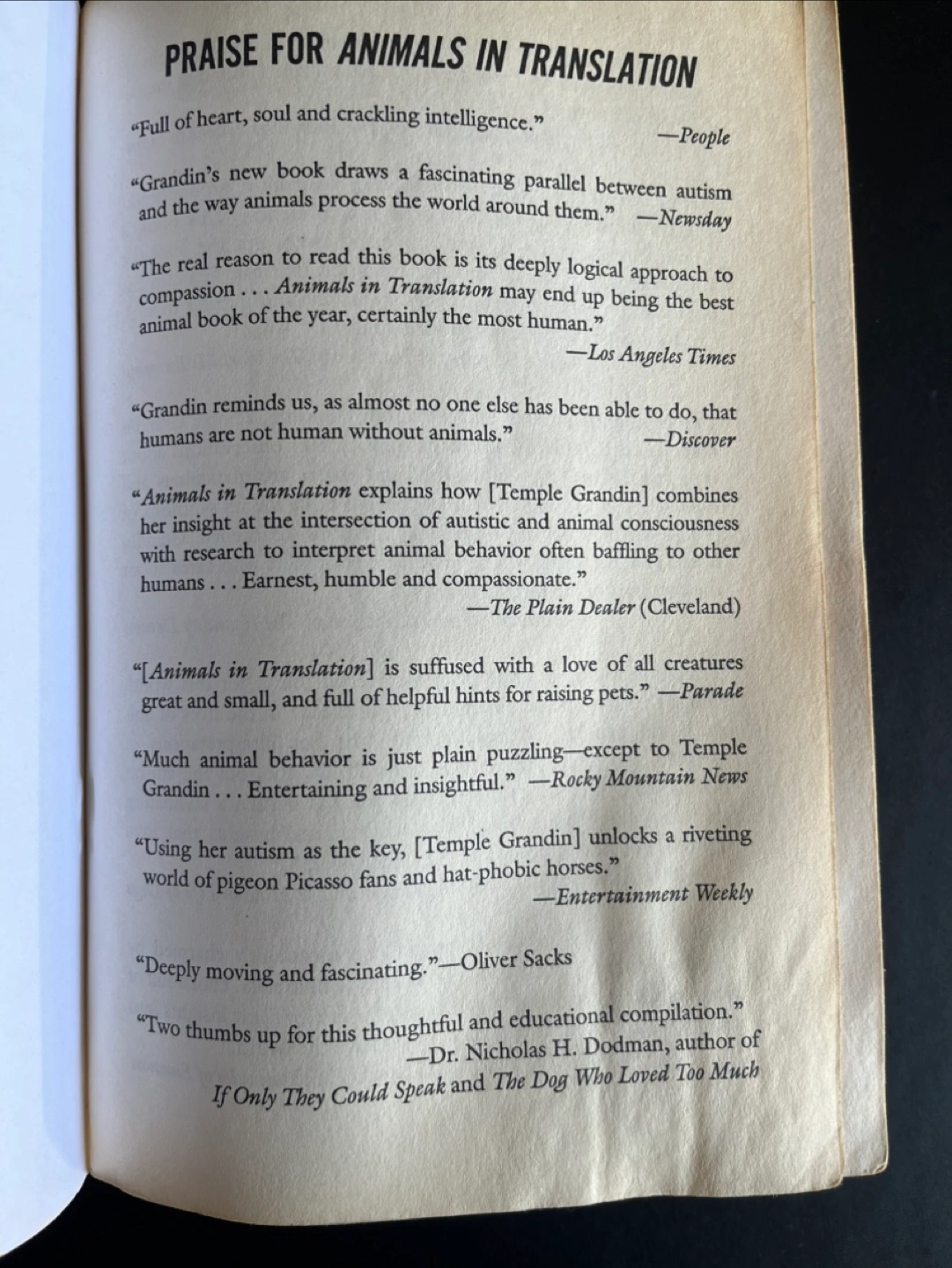Selling a copy of "Animals in Translation: Using the Mysteries of Autism to Decode Animal Behavior" by Temple Grandin and Catherine Johnson