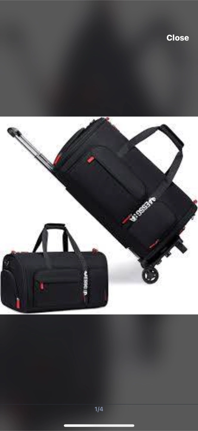 This is a rolling garment bag for travel. It's black and has a detachable trolley. It's still in the original packaging. New