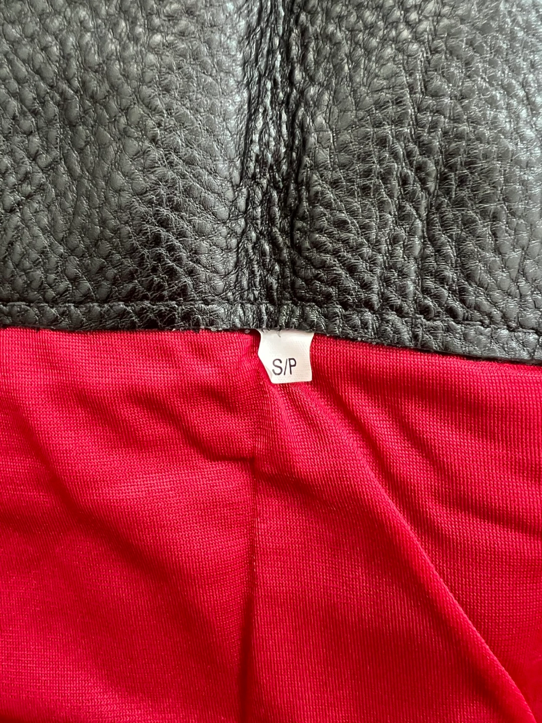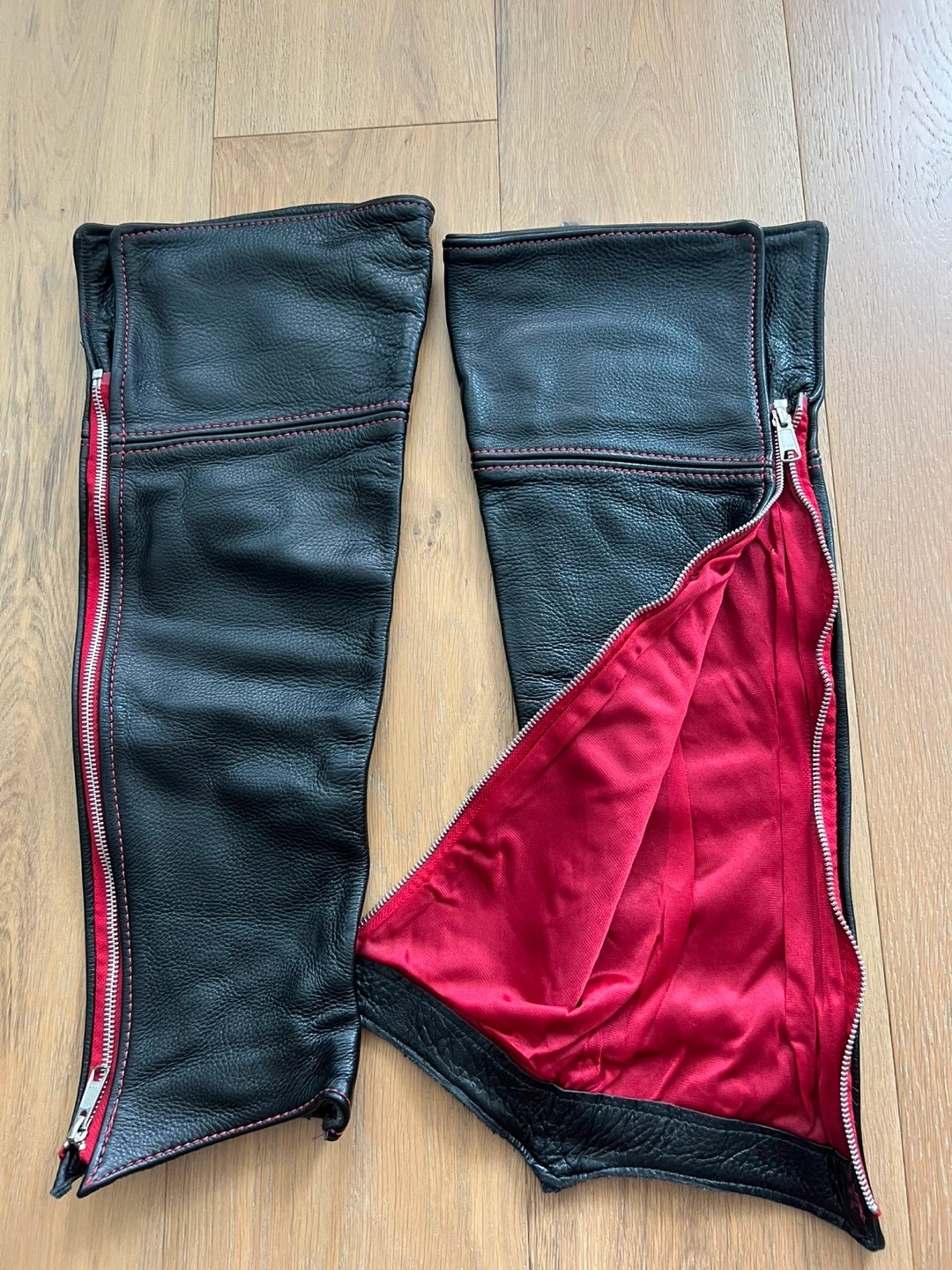 Custom made leather chaps in size S/P. They are black leather with red lining and zipper detail. Beautiful red stitching.