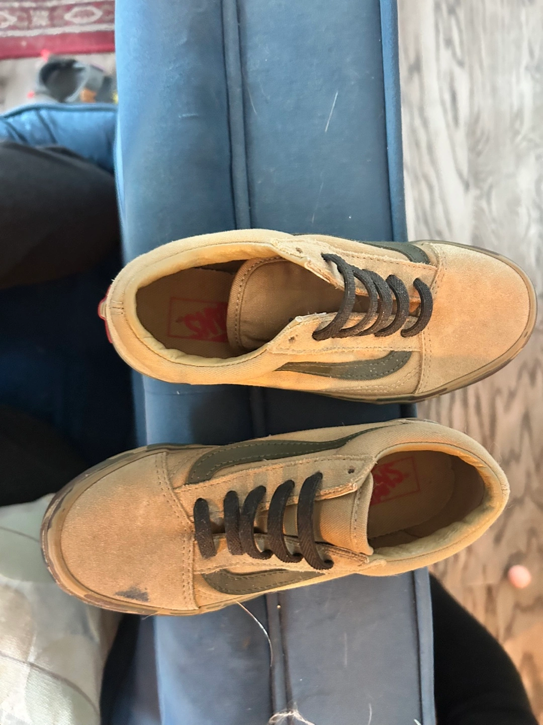 Selling a pair of Vans Old Skool shoes with a camo sole. Youth Size 2. Worn once so they are in great condition and ready for a new home! The upper is a tan suede.
