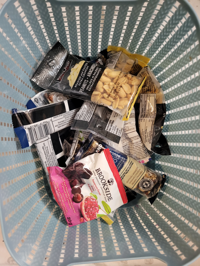 I have a mix of Kirkland Roasted and Salted Peanuts and Brookside Dark Chocolate Pomegranate snacks. The Brookside snacks are 20g each. The peanuts are roasted and salted. Some expired in July and others expire in September