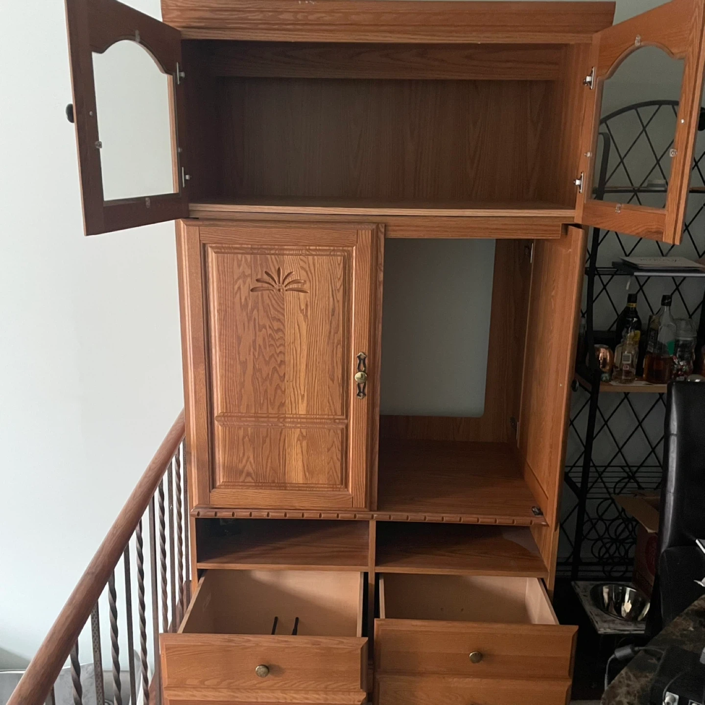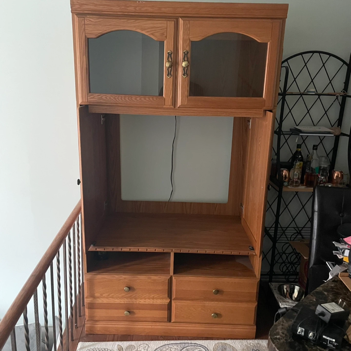Selling a wooden entertainment center. It has a lot of storage with drawers and cabinets, perfect for any living room or entertainment space