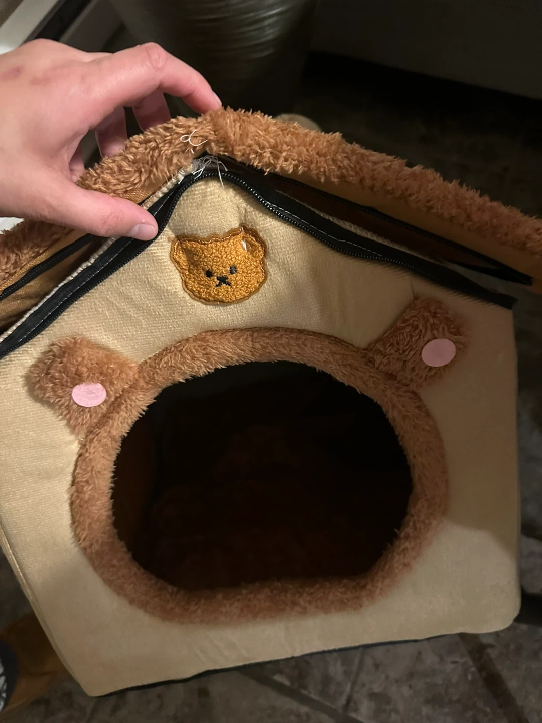 This adorable pet bed cave is perfect for cats or small dogs who love a cozy hideaway! It features a cute bear design with soft, plush material inside. The bed is in great condition and ready for a new furry friend to enjoy. It's lightweight and portable, making it easy to move around the house