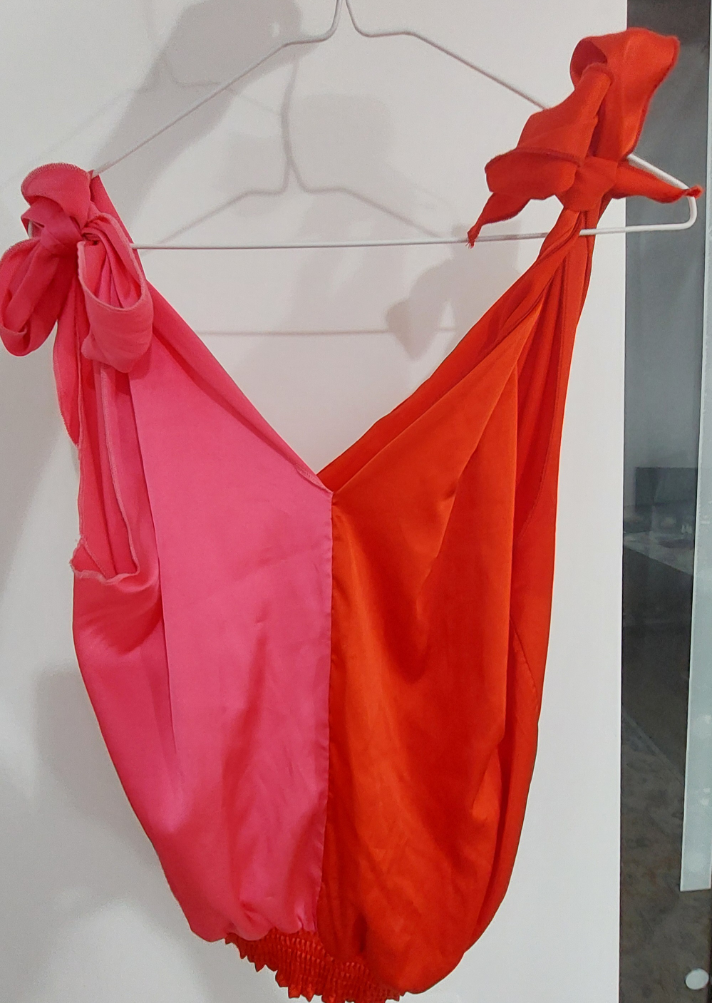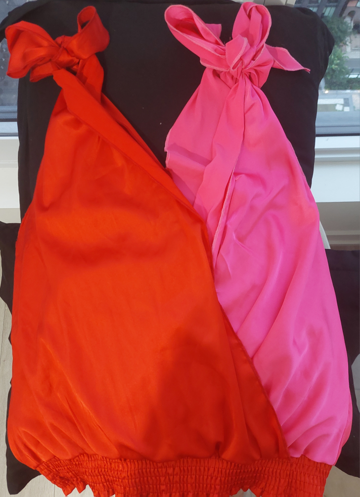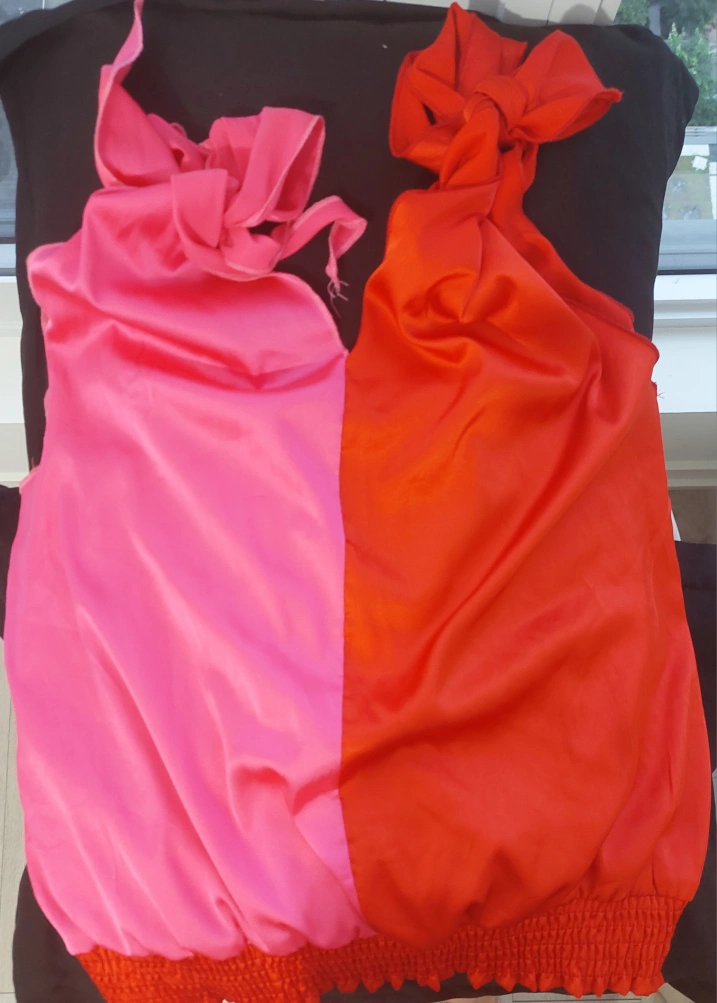 Here's a unique two-tone top in pink and red! It's made of a smooth satin material, perfect for adding a pop of colour to your wardrobe. The top features a tie detail and an elasticated hem.