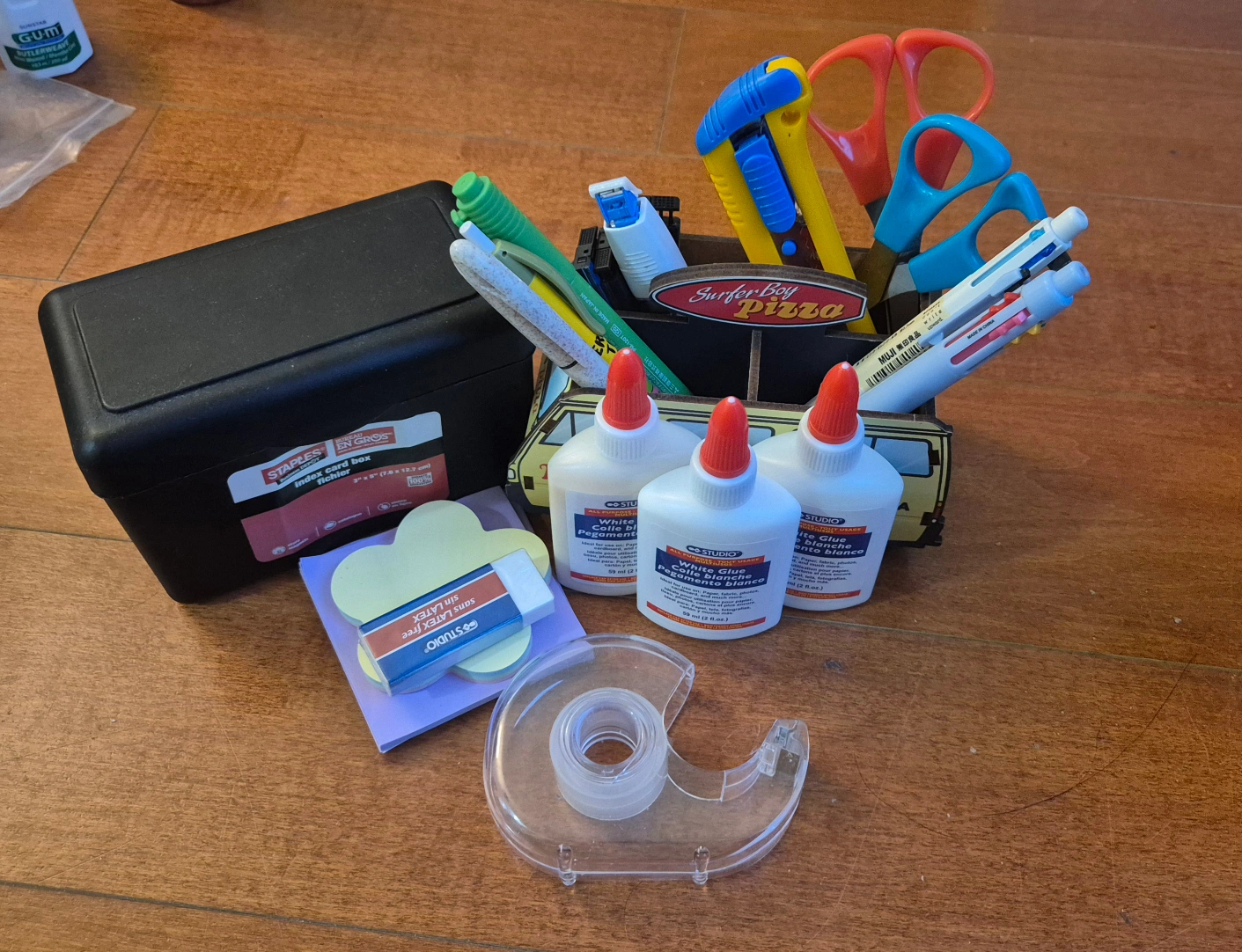 Selling a collection of office and school supplies! Includes a Staples index card box, Studio white glue, sticky notes, tape dispenser, and a pen holder shaped like the Surfer Boy Pizza van! Perfect for getting organized for school or work.