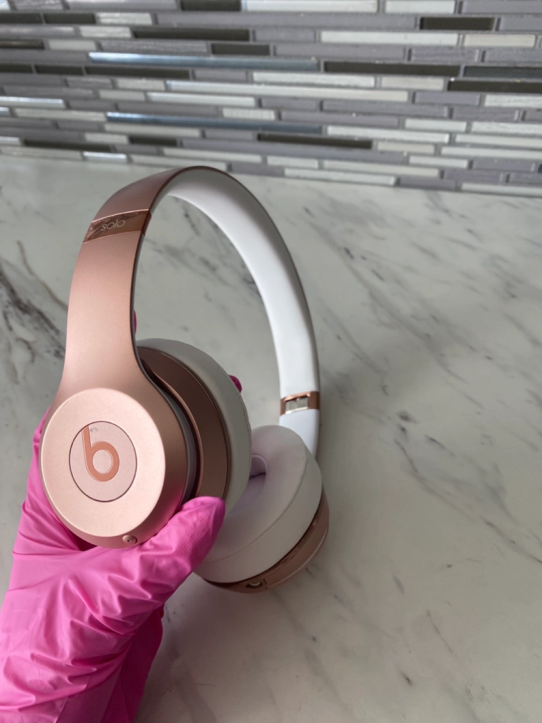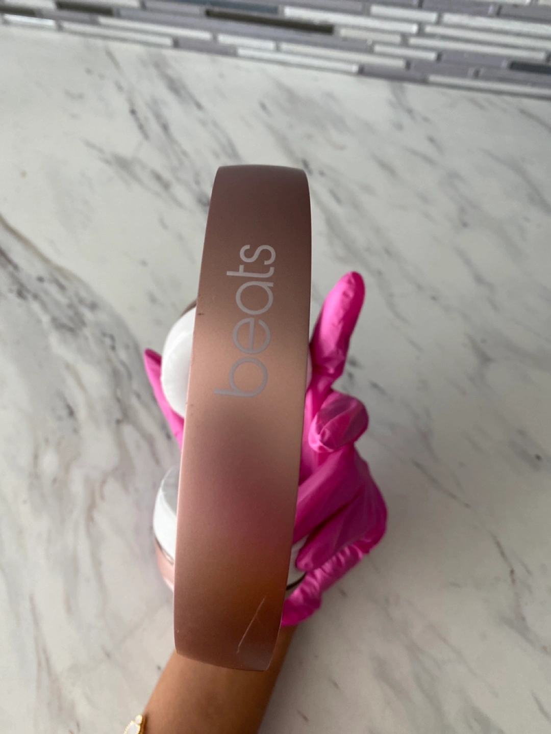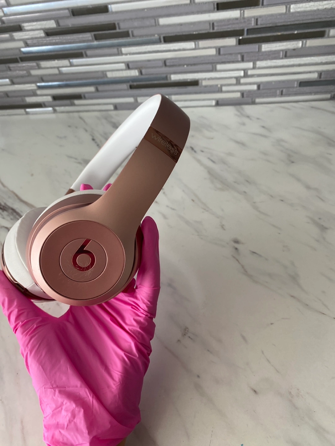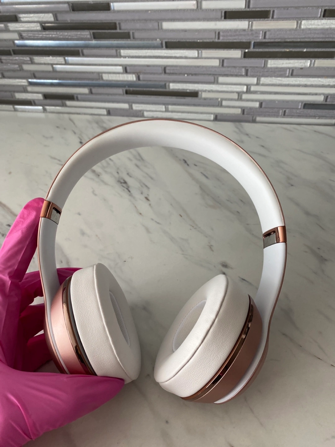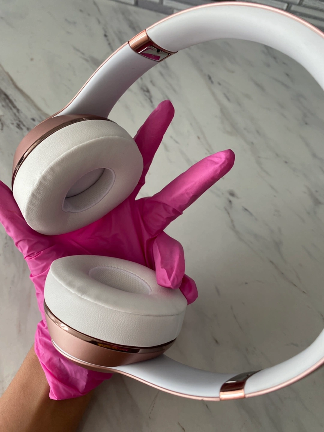 Selling a pair of Beats Solo wireless headphones in rose gold and white. They are in good condition and perfect for listening to your favourite tunes on the go! Brand new ear muffs just got replaced
