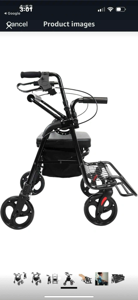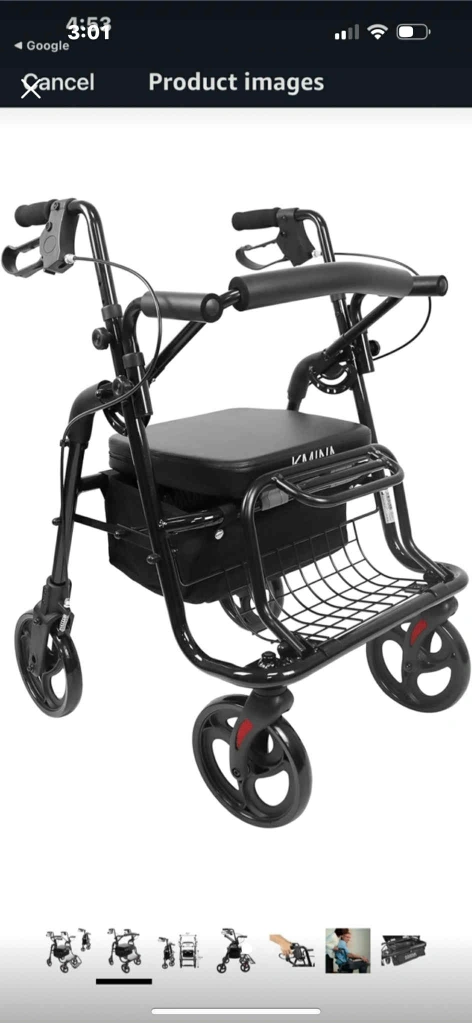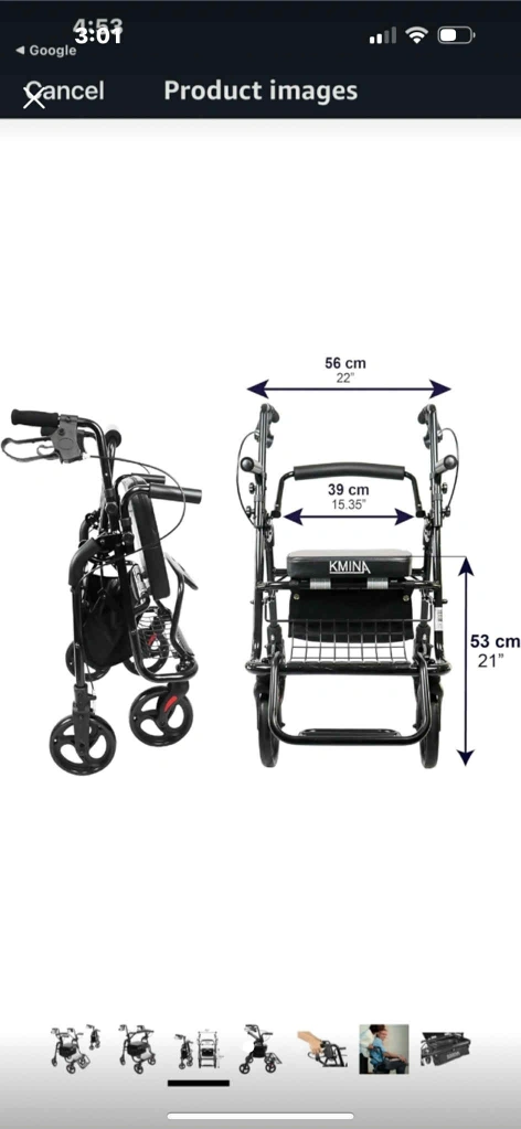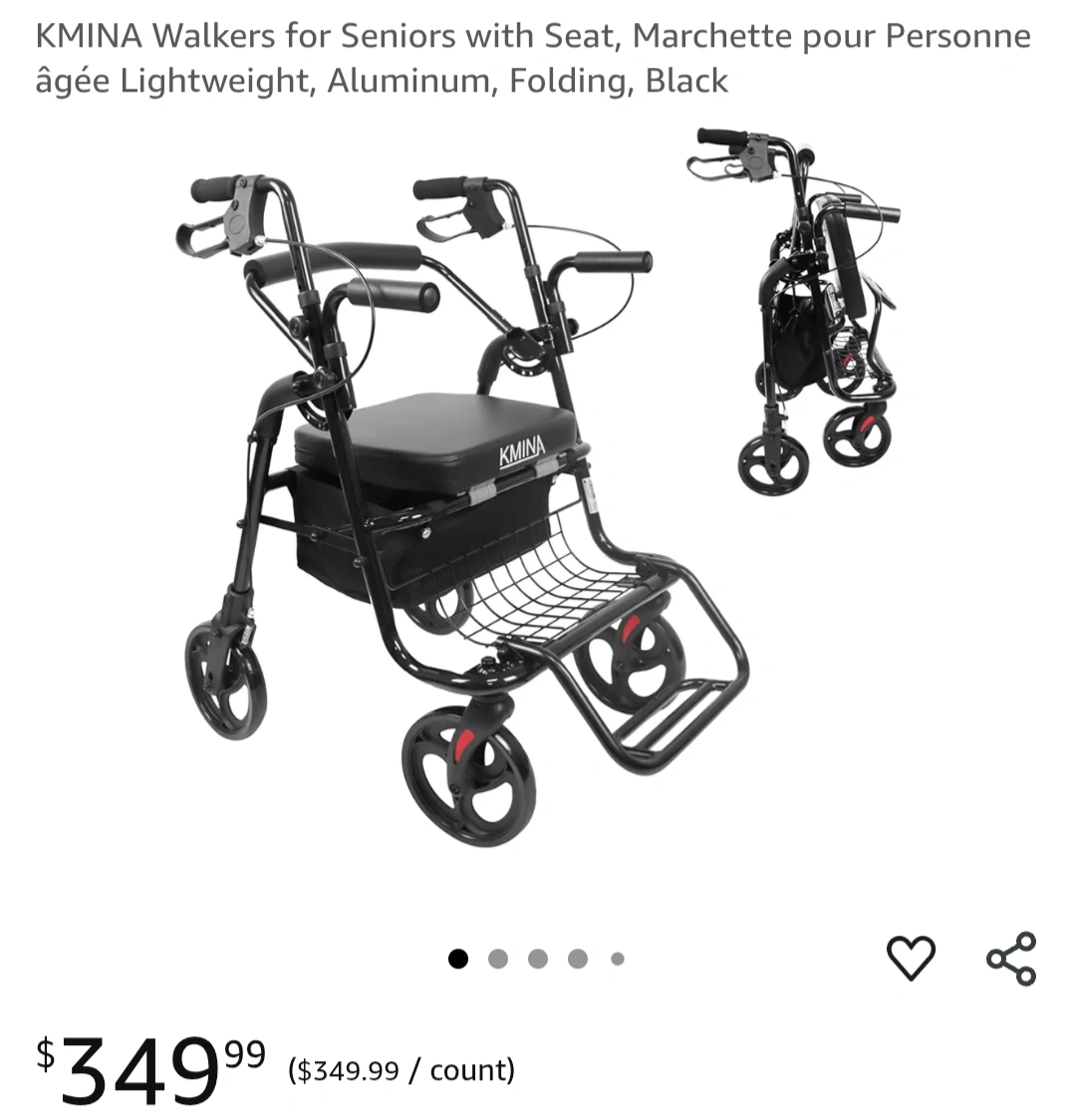 Selling a KMINA Wheelchair walker designed for seniors. It's lightweight and features a comfortable seat. The walker is made from aluminum and is easily foldable for storage and transport.
