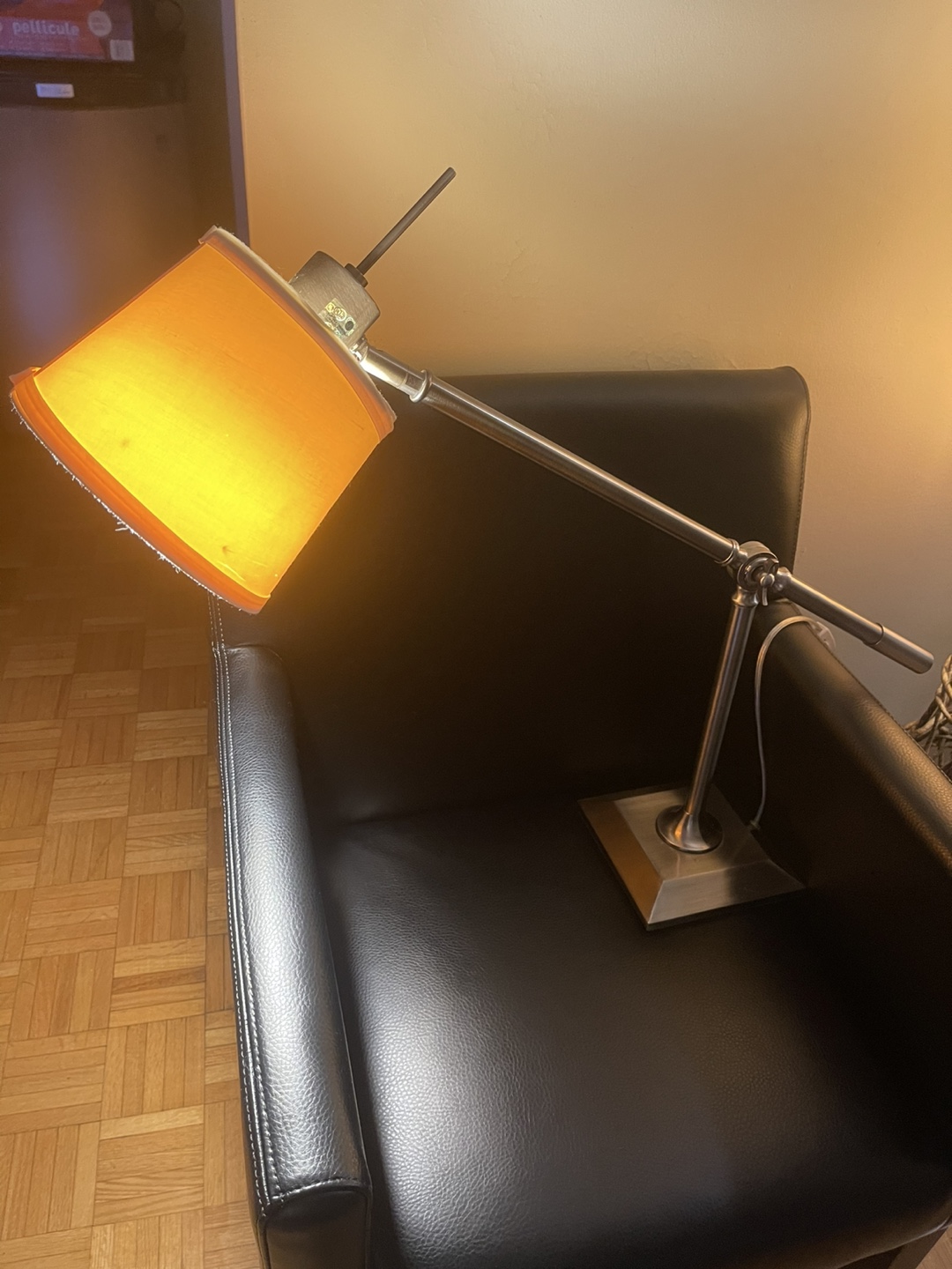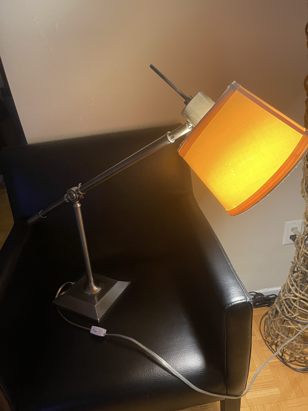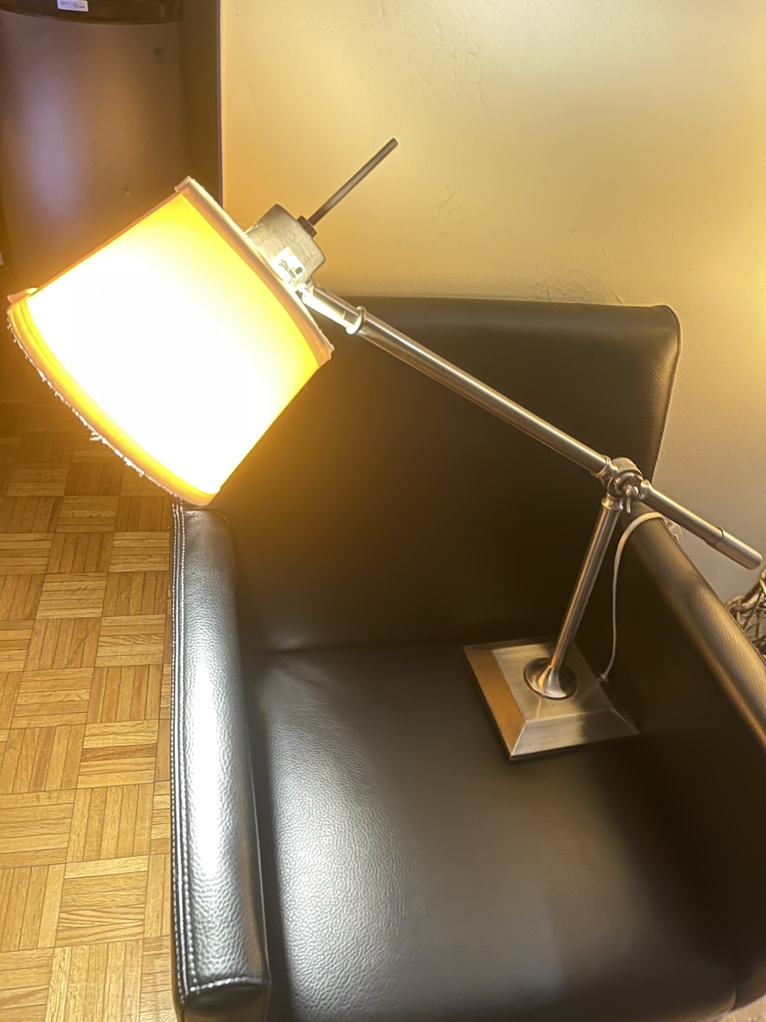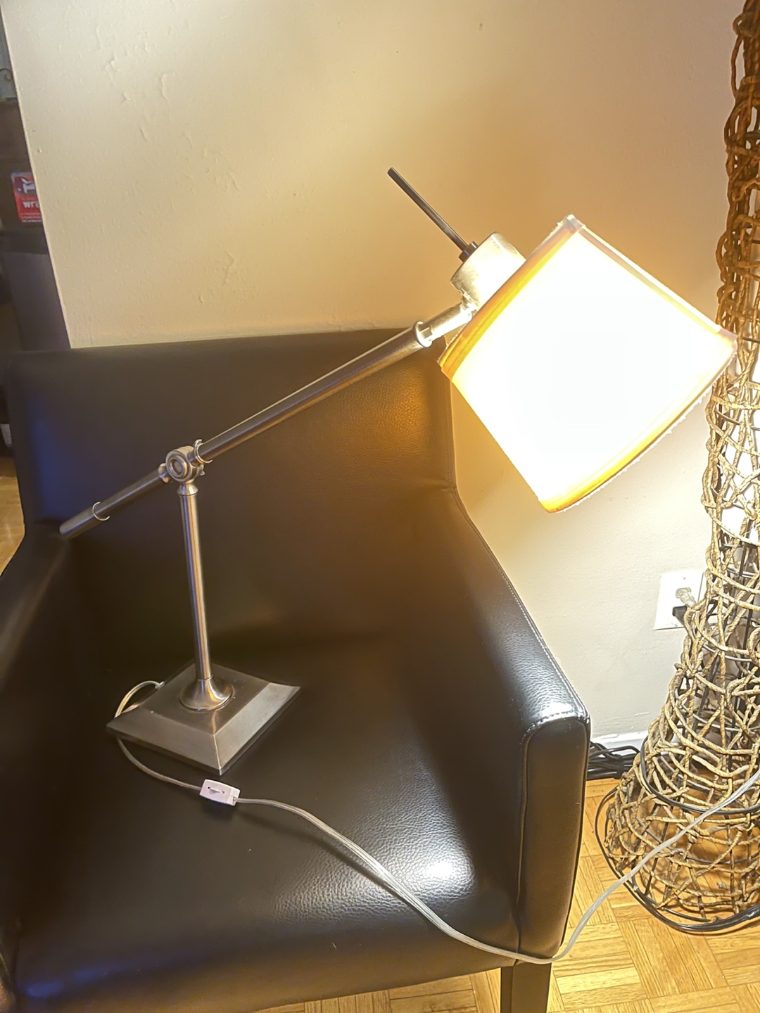 Selling an adjustable desk lamp that's in great condition! The lamp features a square base and a flexible arm, making it perfect for a desk or bedside table. It has a warm, inviting glow when lit up