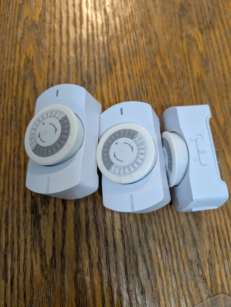 3 plug in Timers Selling three Woods 24-hour plug-in mechanical timers. They're great for automating lights or other small appliances. Easy to set up and use!