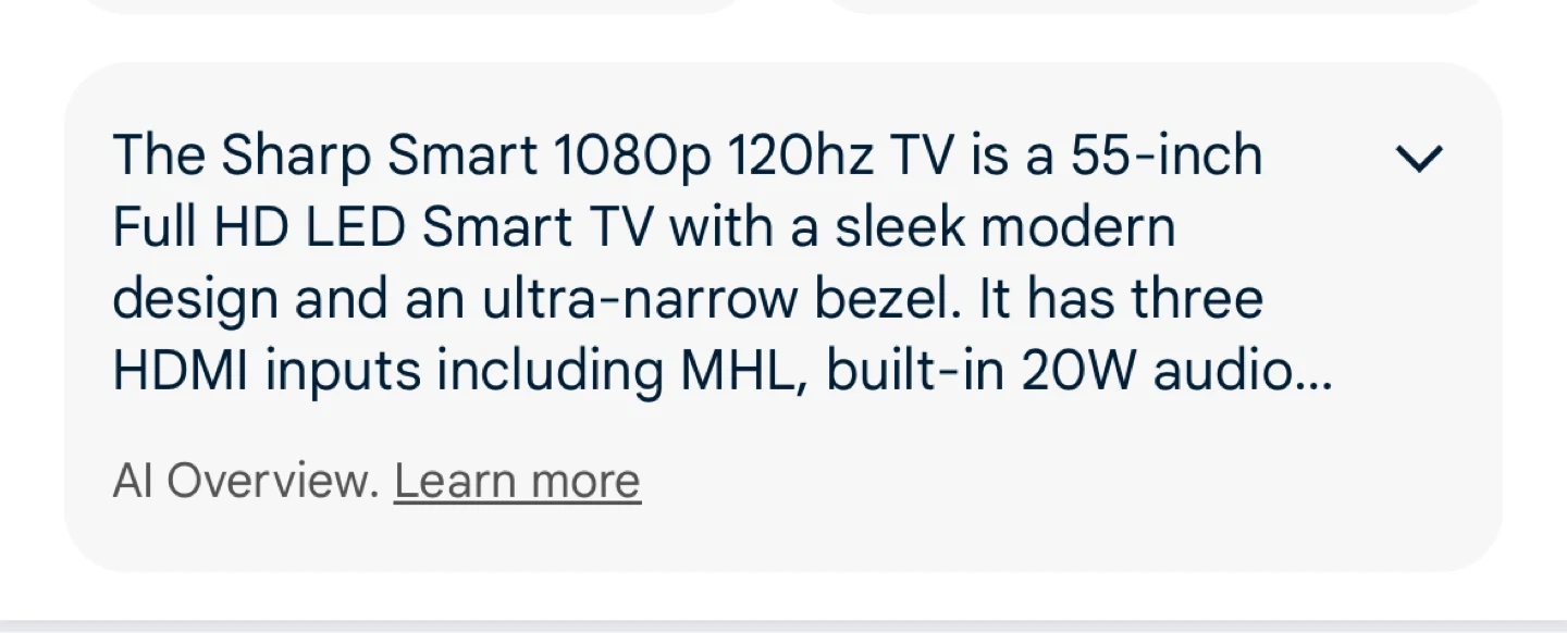 Selling a Sharp 55-inch Smart 1080p 120hz LED TV. It's a Full HD LED Smart TV with a sleek modern design and an ultra-narrow bezel. It also has three HDMI inputs including MHL, built-in 20W audio