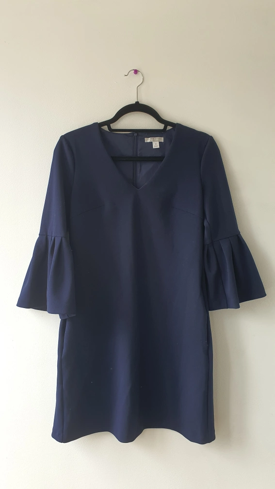 Selling a lovely Le Chateau navy blue dress in size medium. It features stylish bell sleeves and a flattering V-neck. Perfect for any occasion, and the best part, it has sleeves !
