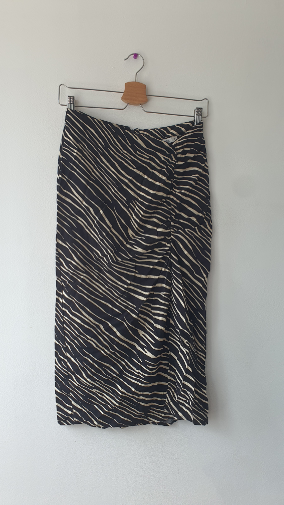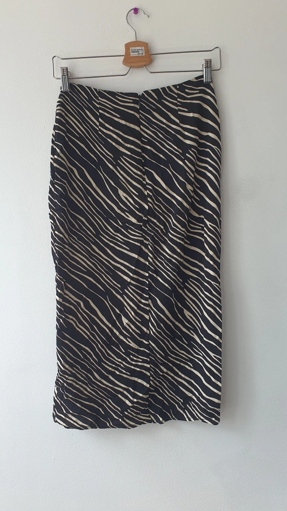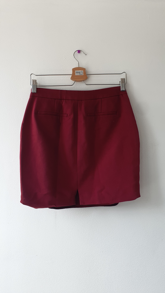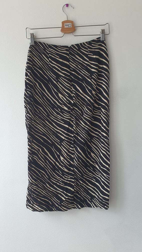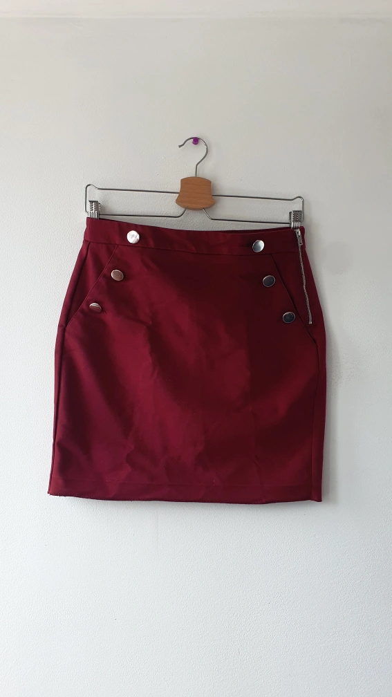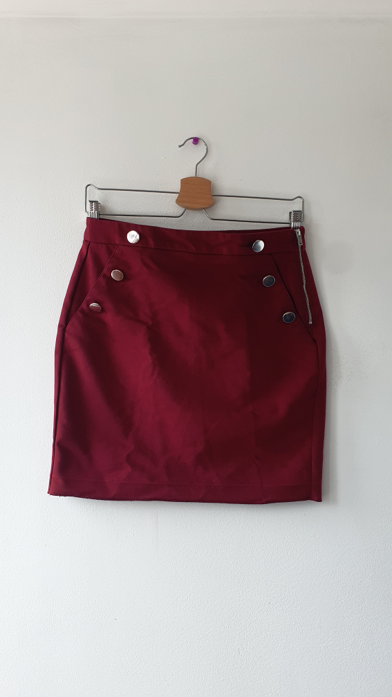 Two skirts for sale! One is a burgundy mini skirt with silver button details. The other is a black and tan zebra print skirt with ruching on one side. Both are in good condition and looking for a new home. Price per piece