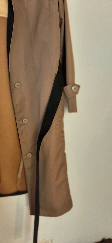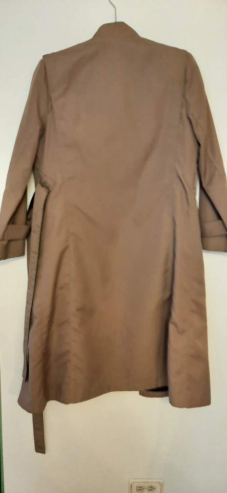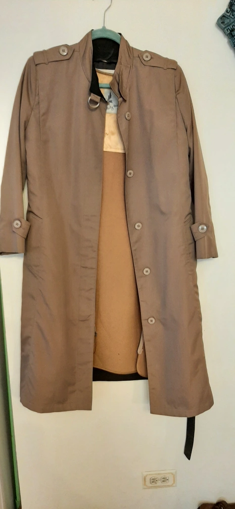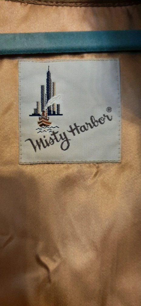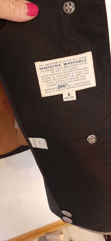 Selling a Misty Harbor trench coat in a size 6 petite. The outer material is 75% Dacron polyester and 25% cotton. It's machine washable and features a stain-repellent treatment.