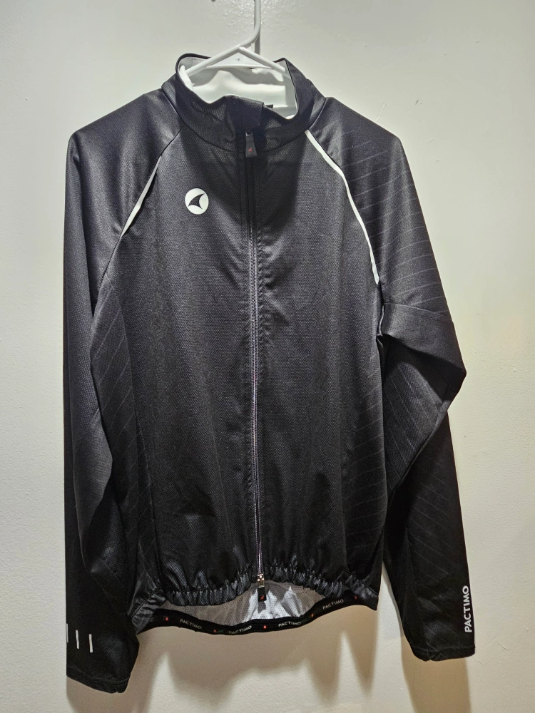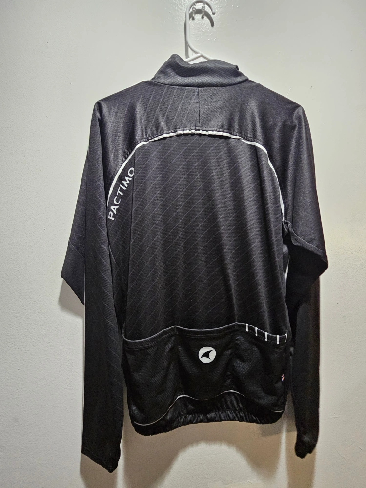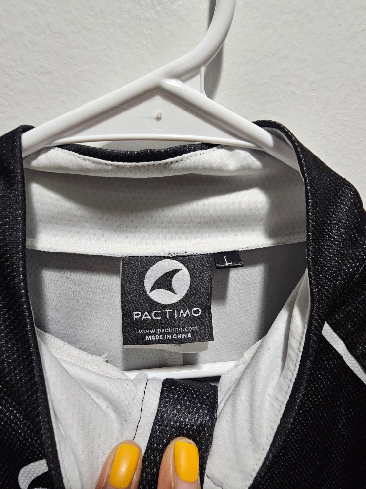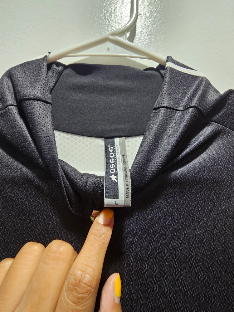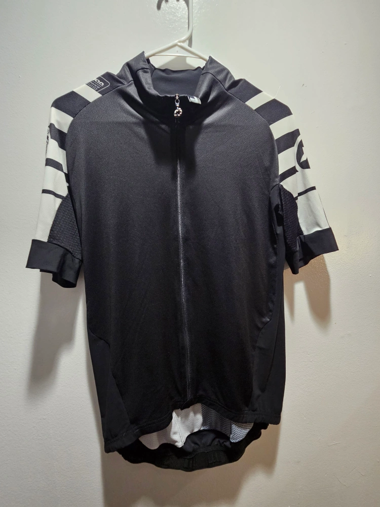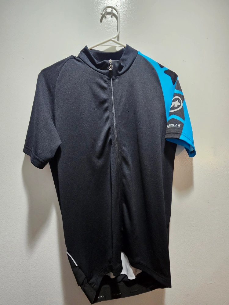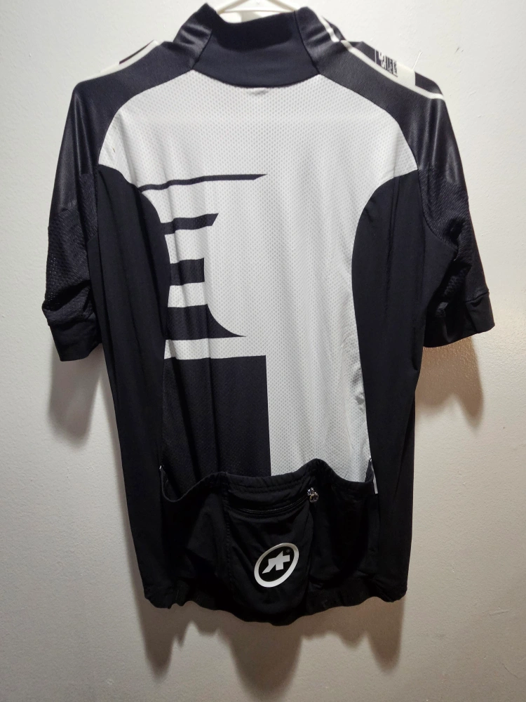 Selling an Assos cycling jersey in size L. It features a full zip and a stylish design with black, white, and blue accents. Perfect for your next ride!