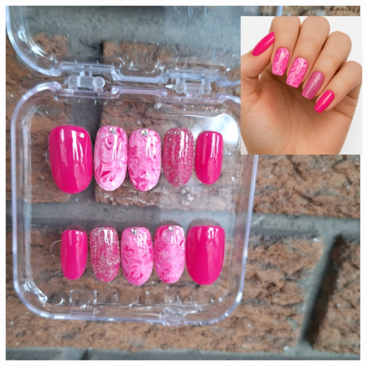 Brand new set of pink press-on nails! Includes a variety of designs like solid pink, pink marble, and glitter accents. Perfect for a quick and easy manicure at home