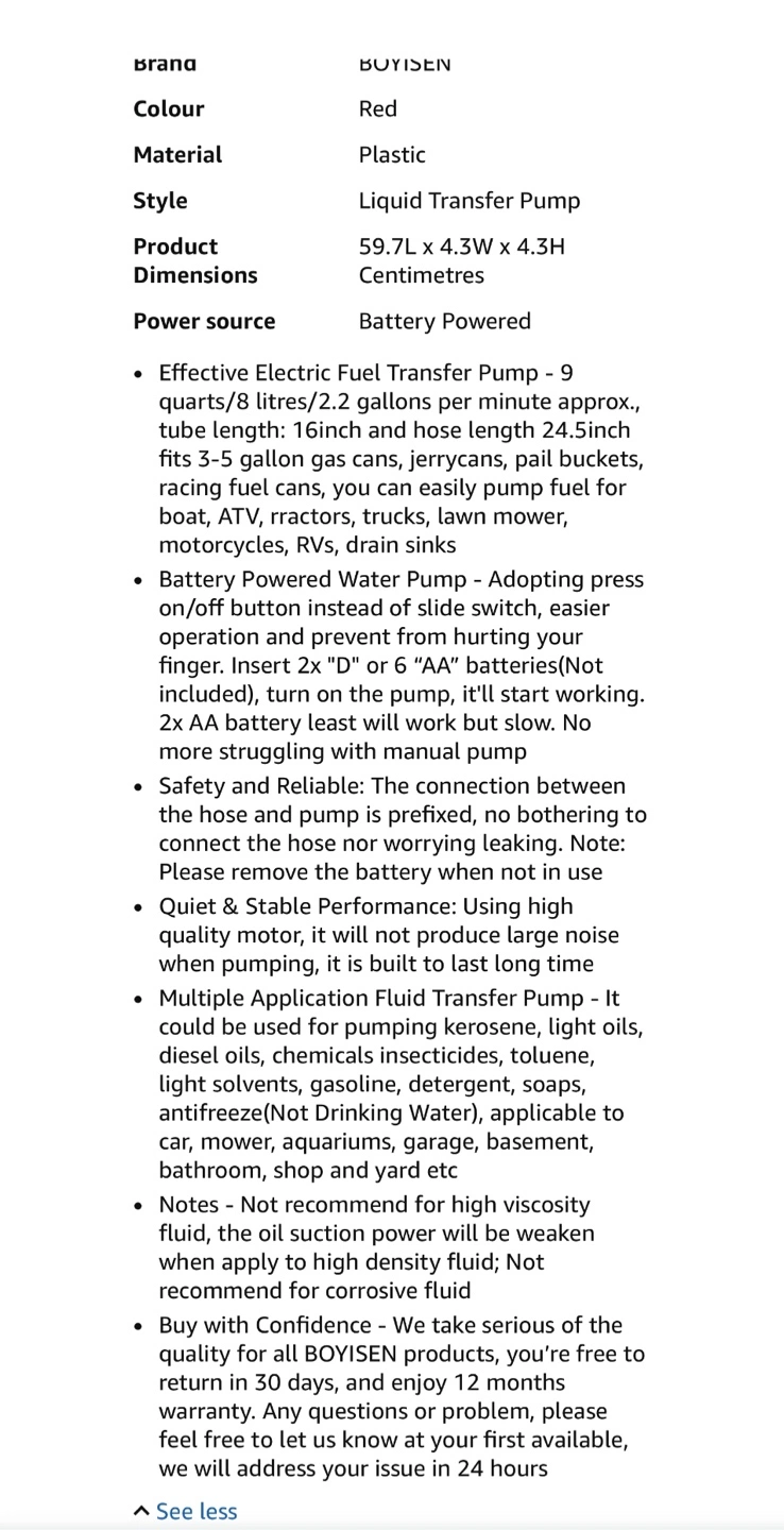 Brand new never used - don’t need. This BOYISEN battery-operated liquid transfer pump is designed for gasoline, diesel, water and oil, offering a flow rate of 2.2 gallons per minute. It's a handy tool for various fluid transfer needs!