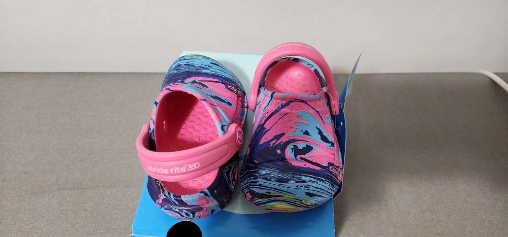 These Stride Rite 360 Bray clogs are in excellent condition and come with the original box! They feature a fun rainbow marble design with pink accents. The size is 3M (toddler), and they're machine washable for easy cleaning