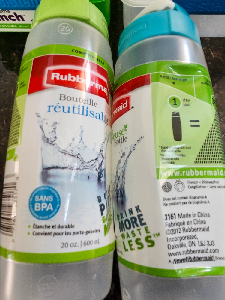 The Rubbermaid bottles are 20 oz / 600 mL each and are BPA free. They are durable and leakproof.